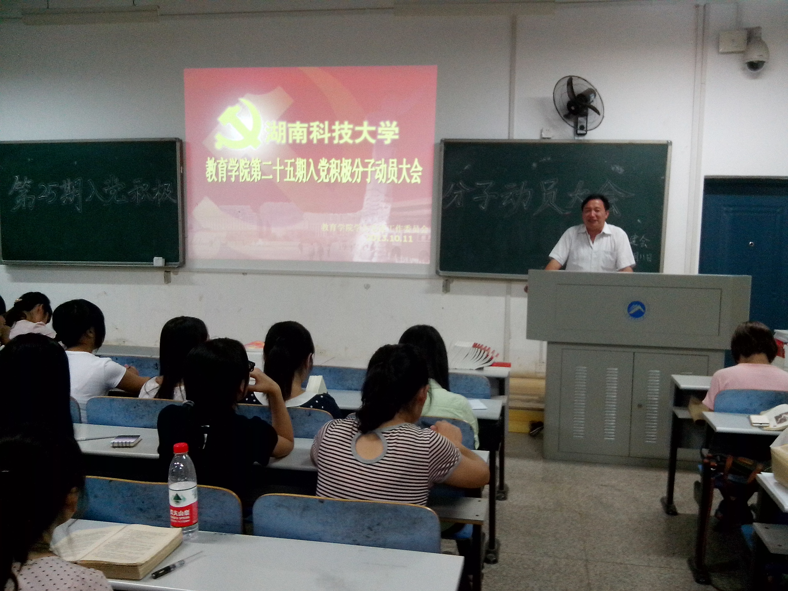 为贯彻学院党委关于学生党建工作要求,10月11日晚7:00,教育学院第二十五期入党积极分子动员大会于八教2-2隆重举行。出席此次大会的嘉宾有我院党委副书记王伟清同志、学工办老师胡银华和李涛同志。我院学生党建工作委员会副书记李卫省同志、党建各部长、各学生支部副书记及全院入党积极分子参加了本次动员大会。