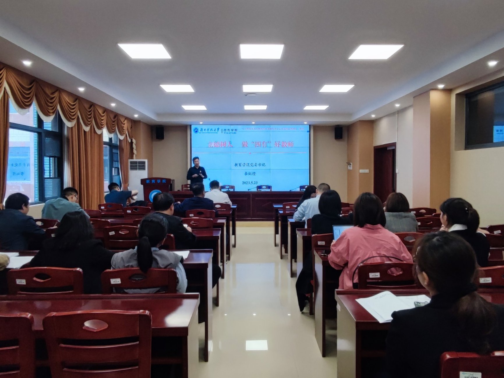 5月23日下午,院党委书记李炳煌在敏行楼A333以《立德树人 做“四有”好教师》为题讲授专题党课。教育学院全体教工党员与会。