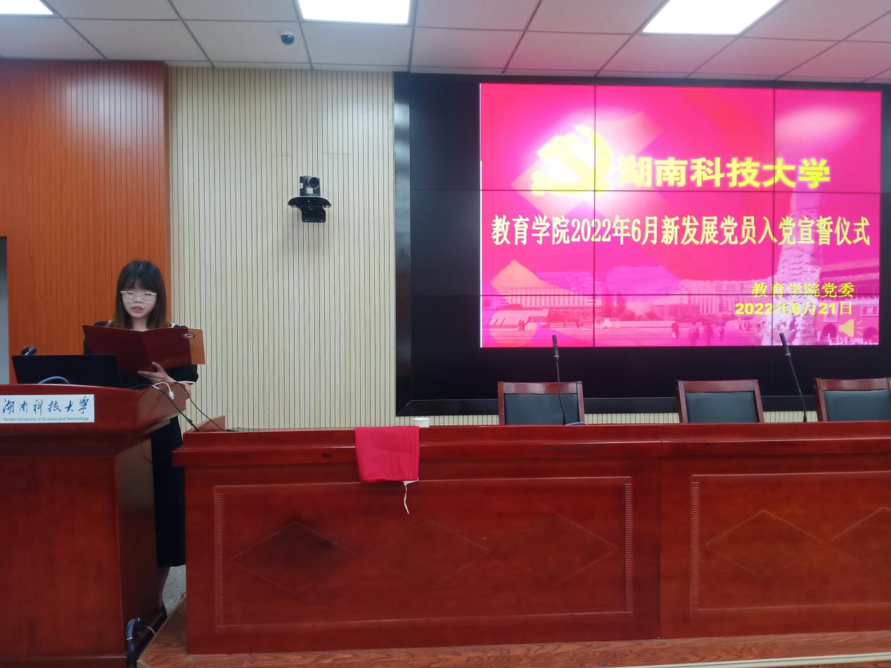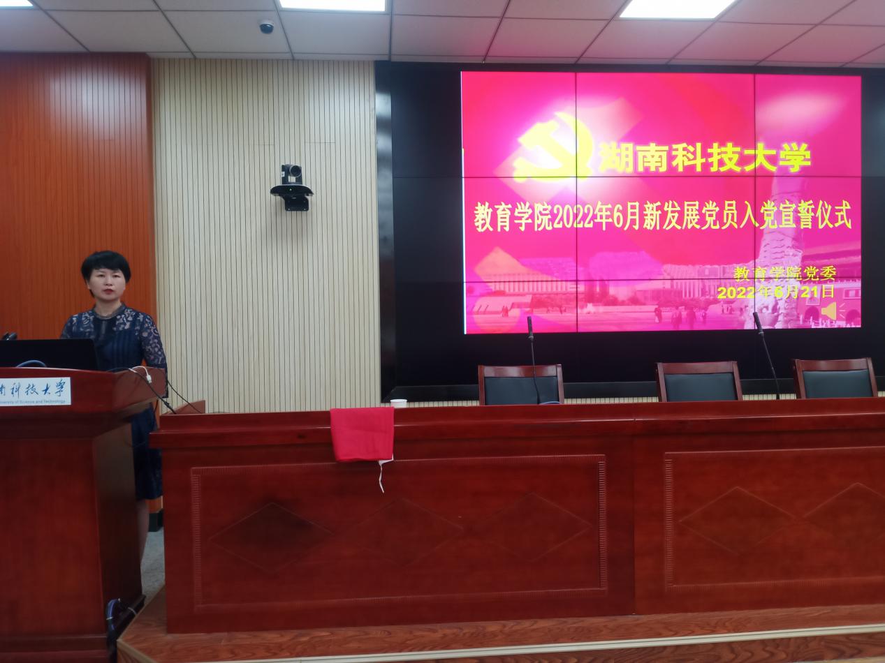 6月21日上午十点,教育学院2022年6月新发展党员入党宣誓大会在第八教学楼308会议室顺利举行。教育学院全体学生党员参加此次大会,党委副书记刘婕同志出席本次大会。本次会议由第四学生党支部书记胡银华老师主持。