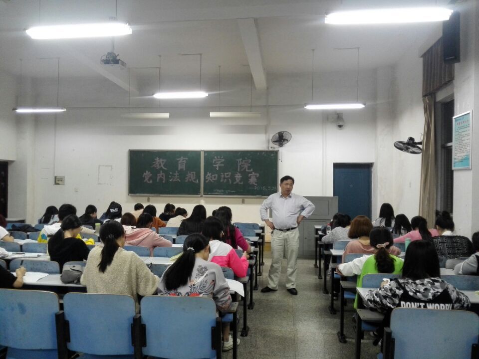 为深入学习贯彻习近平总书记系列重要讲话精神,推动全面从严治党面向广大党员延伸,巩固拓展党的群众路线教育实践活动和“三严三实”专题教育成果,进一步解决党员队伍在思想、组织、作风、纪律等方面存在的问题,保持发展党的先进性和纯洁性。我院积极开展“学党章党规、学系列讲话,做合格党员”(两学一做)专题学习教育工作。2016年5月23日晚七点三十分,教育学院全体学生党员在第八教学楼4-4教室参加党内法规知识竞赛。