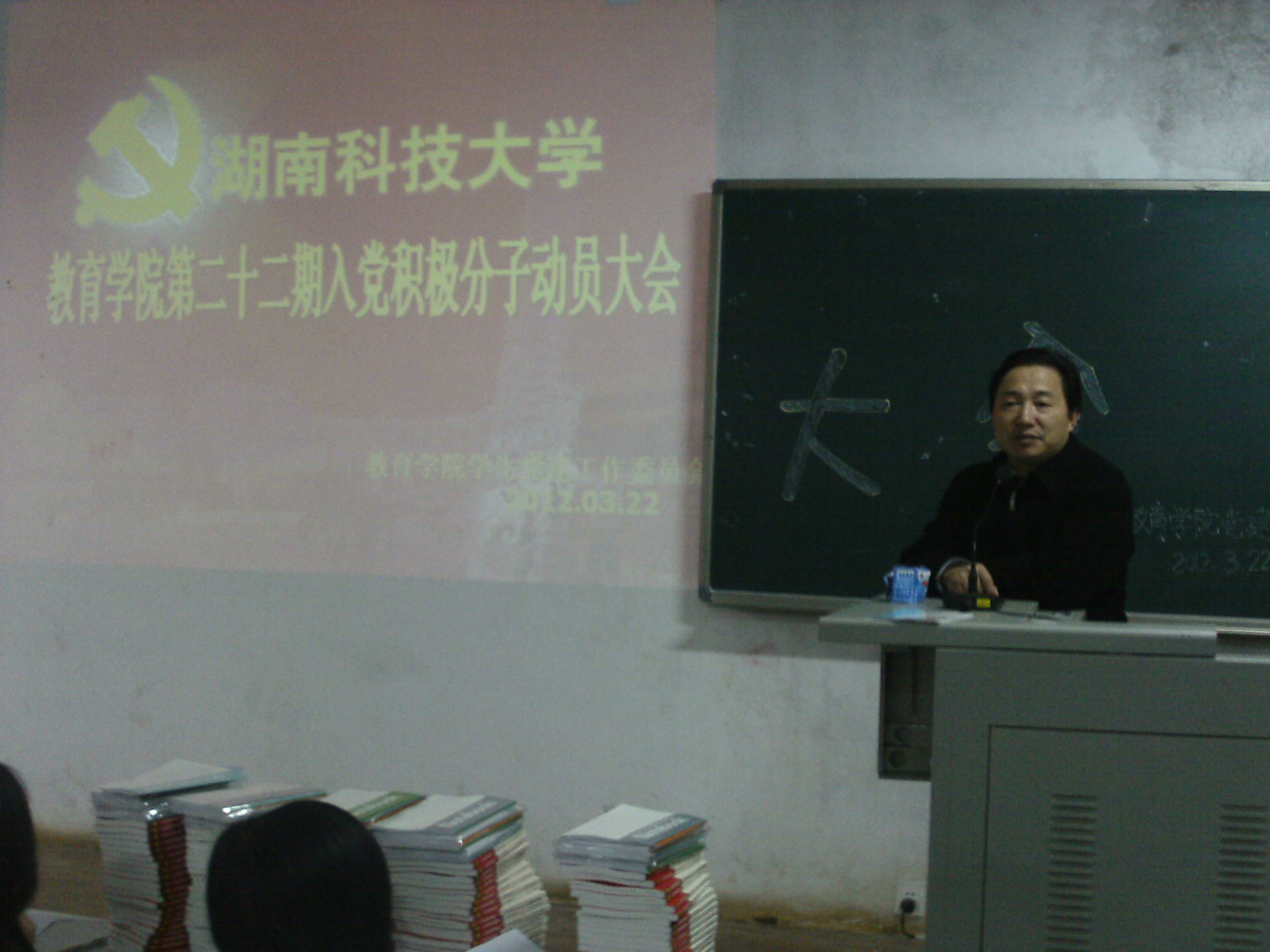 3月22日晚,教育学院学生党支部在第八教学楼1—6教室举行了第二十二期入党积分子动员大会。我院党委副书记、党校教育学院分校校长王伟清同志、院本科生支部书记胡银华同志、院研究生支部书记练素华同志、学生党建会副书记易溪宇同志出席了本次动员大会。