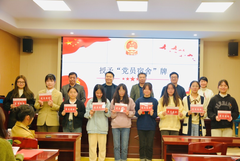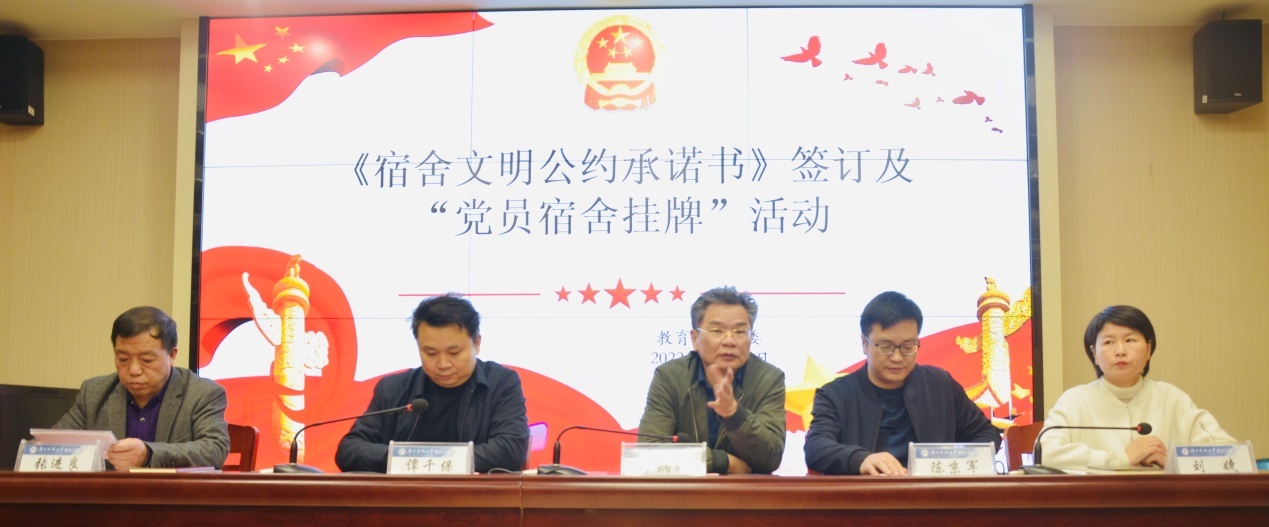 学生党员代表田玺如同志宣读《宿舍文明公约》,全体学生党员签订《教育学院学生党员〈宿舍文明公约承诺书〉》,全体党委委员为所有学生党员宿舍进行授牌。
