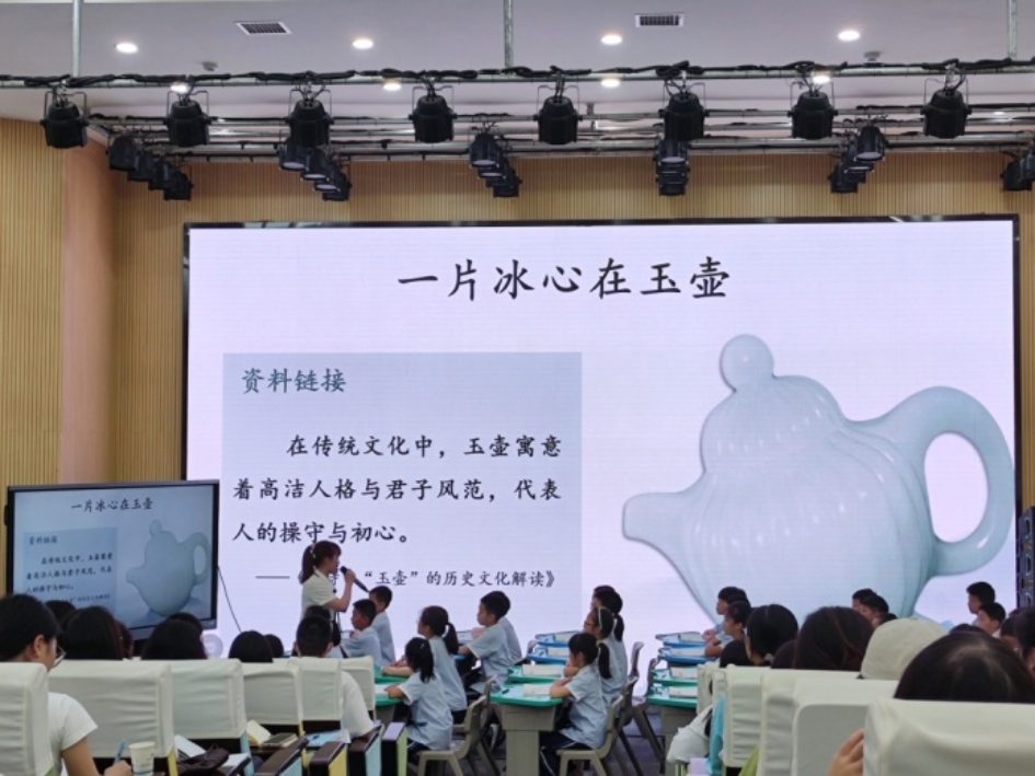 语文老师李婕为大家带来了片段教学《芙蓉楼送辛渐》,她的诗歌教学富含新意,饱含情感,她的文化底蕴滋养着学生。她以“玉壶”为切入点,从玉壶的文化意象引出诗人的思想情感,结合诗人的时代背景,一遍遍有感情的朗读,使学生真正感悟诗人高风亮节的人格和乐观坚定的胸襟。