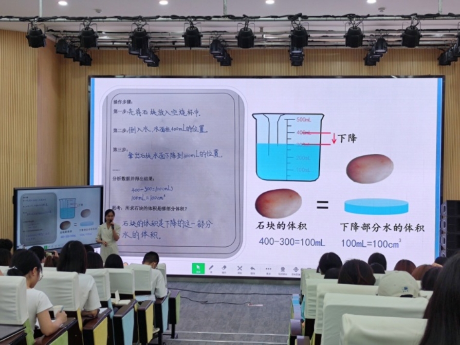 见习活动的第二个环节,主要是针对近年来学生在找工作面试过程中要求提供“教学视频”而设计的,被中小学教师命名为“无生课堂”,即只有教师教学环节的演示,而没有学生的配合,以此展示教师的教学设计和教学基本功。左双老师以《求不规则物体的体积》为课题,展示了一堂生动直观的无生课堂教学,为大家将来的求职就业做了很好的示范。
