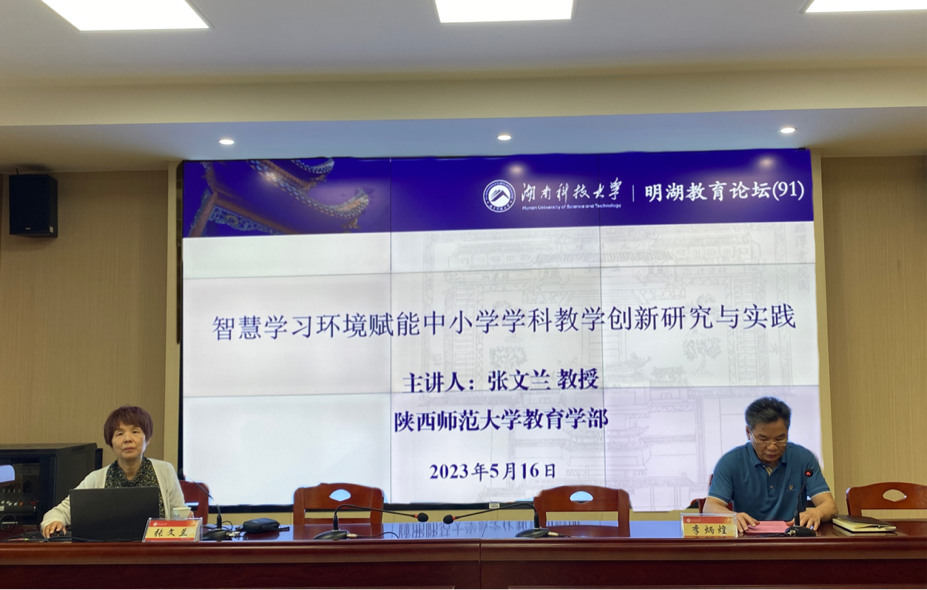 5月16日下午,陕西师范大学教育学部教授、博士生导师张文兰做客“明湖教育论坛”,在敏行楼A333报告厅为我院师生带来题为“智慧学习环境赋能中小学学科教学创新研究与实践”的学术讲座。讲座由教育学院党委书记李炳煌主持,教育学院教师代表,研究生到场聆听。