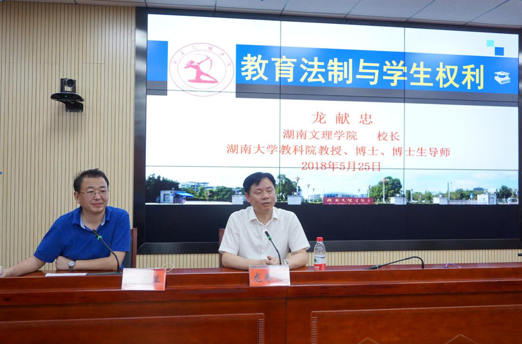 2018年5月25日晚7:00,湖南文理学院校长龙献忠教授做客“明湖教育论坛”(第35讲),在教育学院308学术报告厅为我院师生带来了题为“教育法制与学生权利”的学术报告。报告会由教育学院院长李海萍主持。