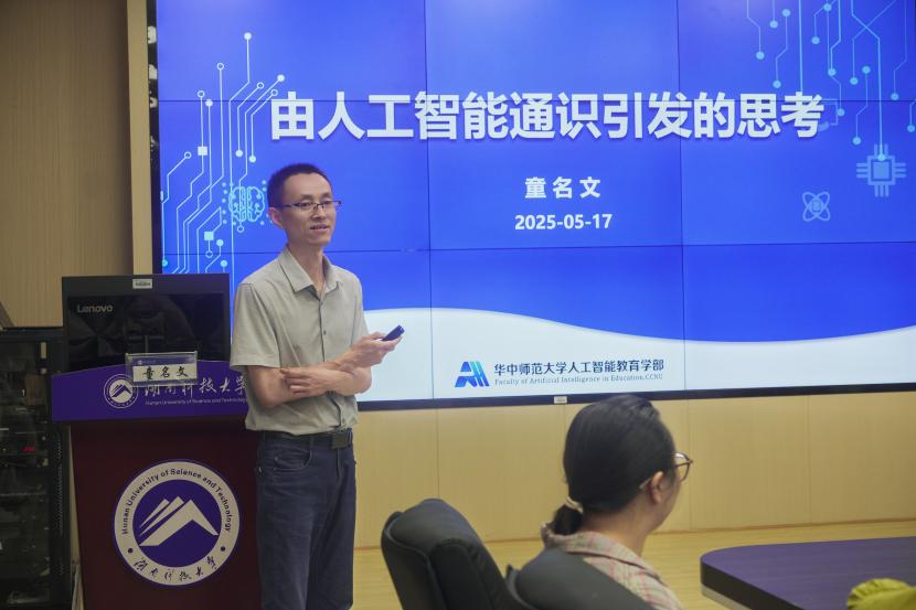 5月18日晚,华中师范大学人工智能教育学院副院长,教授,博士生导师童名文做客“明湖教育论坛”,在敏行楼A333为我校师生带来“由人工智能通识课引发的思考”主题讲座。讲座由我院副院长张进良主持。