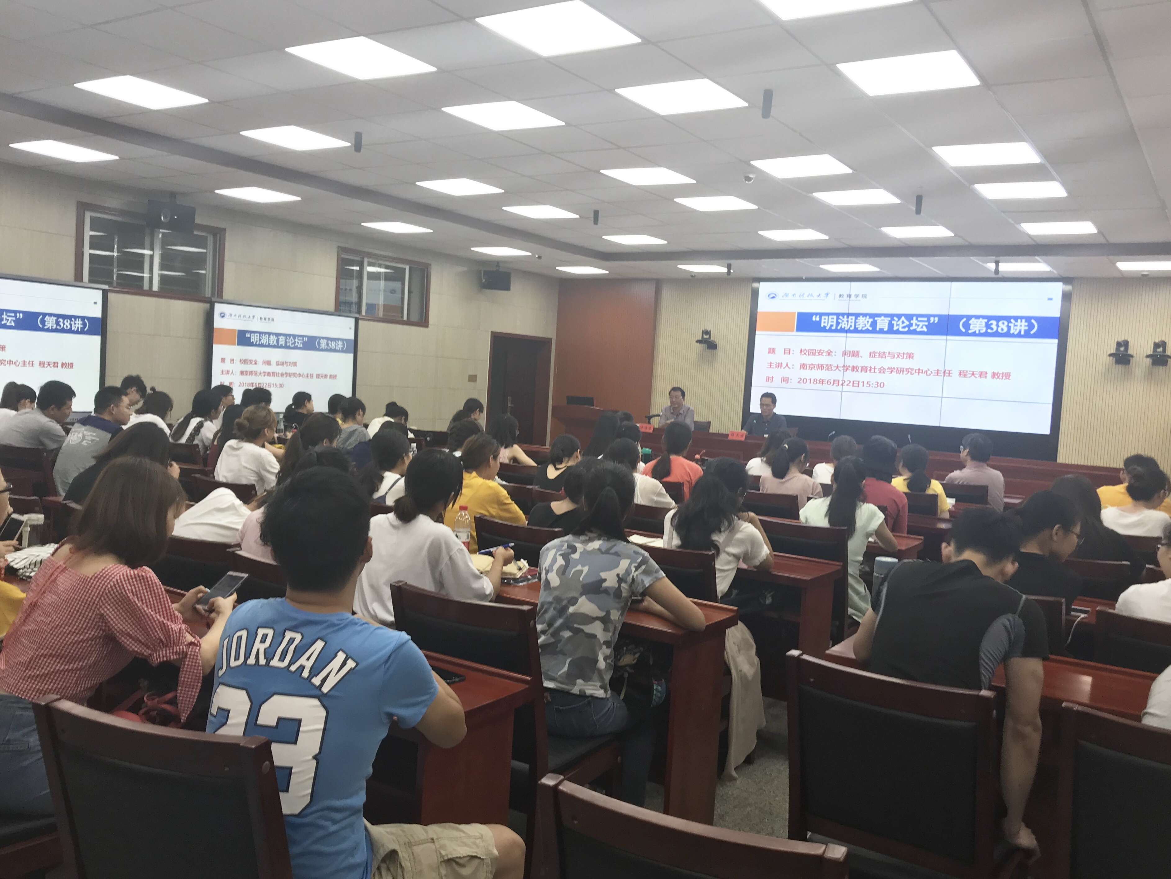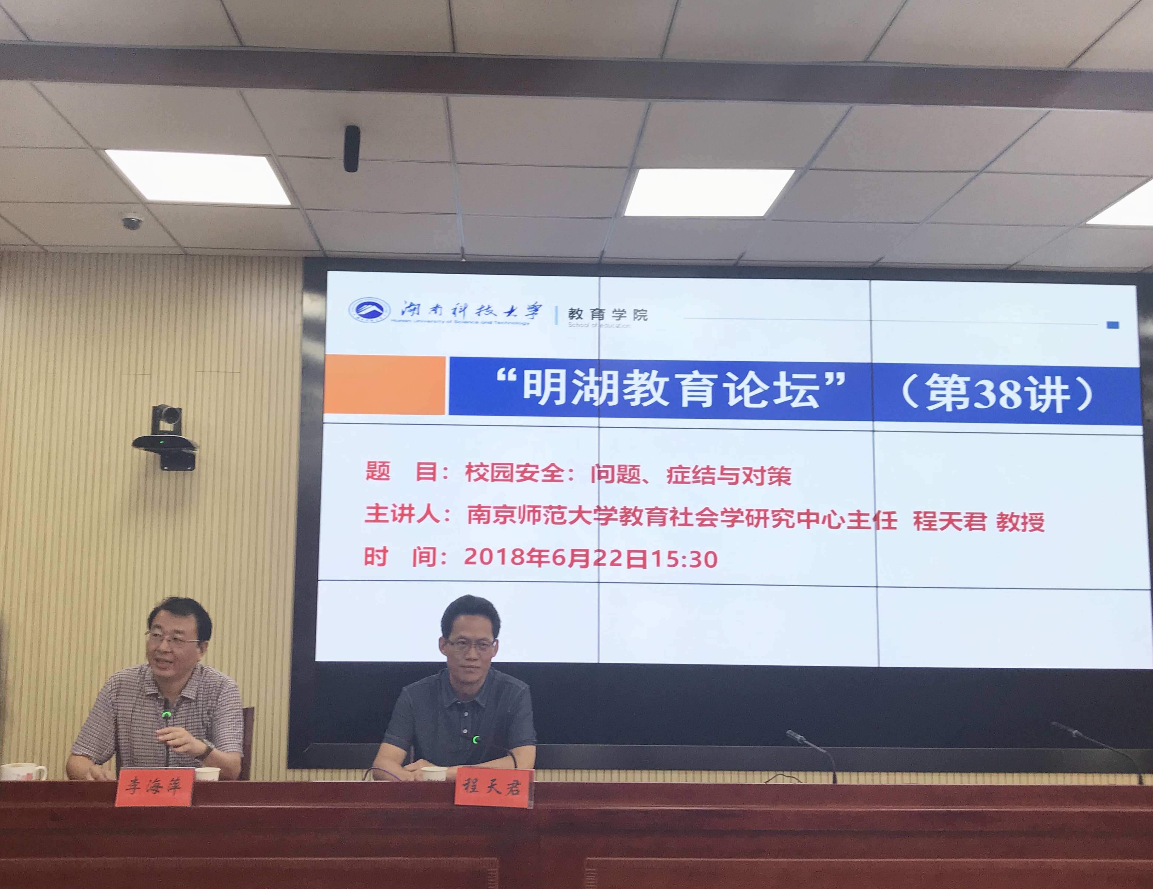 2018年6月22日下午,长江学者特聘教授、南京师范大学教育社会学研究中心主任程天君教授做客“明湖教育论坛”,为我院师生作题为“校园安全:问题、症结与对策”的学术报告。学术报告会由教育学院院长李海萍主持。