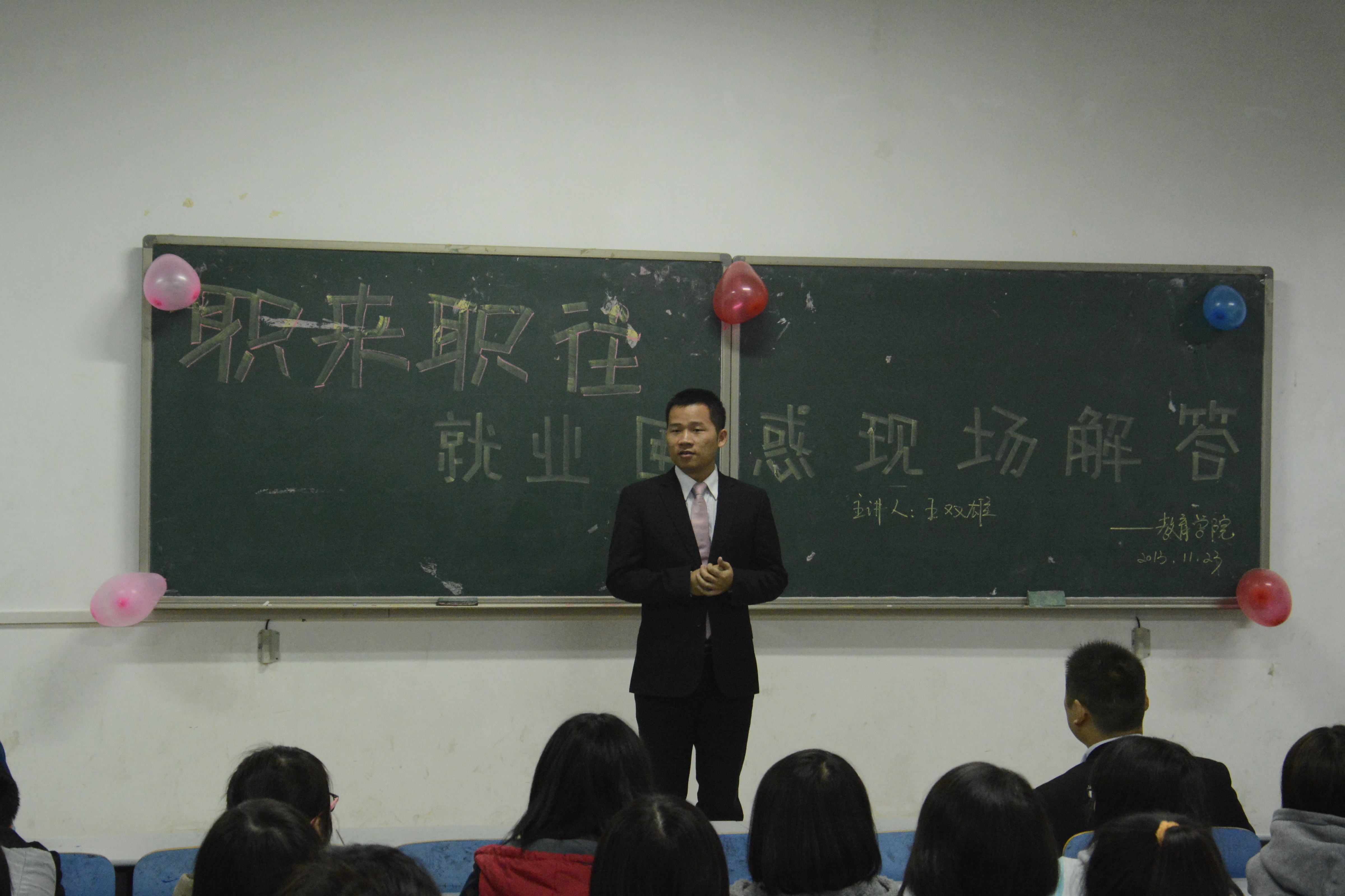 11月23日19:00,现场版的《职来职往》使八教1-5人声鼎沸:我院2005届毕业生王双雄为教育学院10级的“准毕业生们”面对面解答就业困惑,这次活动由我院校友资源部主办。