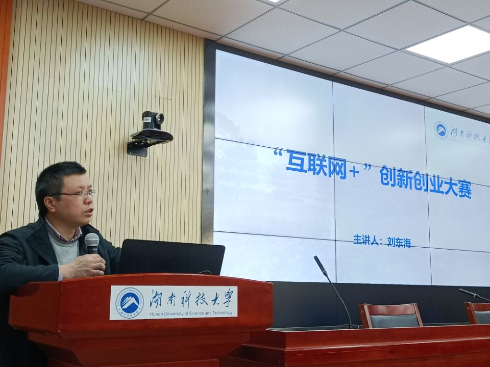 随后,刘东海首先回顾了我校在“互联网+”创新创业大赛所取得的成绩,同时指出我校与湖南其他几所高校相比,在创新创业大赛中的优势与不足。紧接着,他指出了教育类选题的几大范围,如乡村振兴、乡村医疗、助力农业、节能减排等,并强调一个好的项目需要精心打磨、团队配合。之后,他以四个精彩、专业的案例,从项目活动如何有效开展、项目PPT的精良制作以及对未来美好而可行的展望等几个方面一一进行了详细地讲解,在座的同学表示受益匪浅。