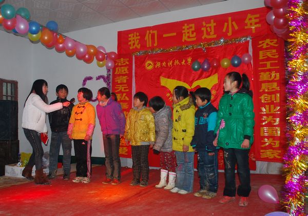 1月26日,我校教育学院33名学生志愿者来到娄底市双峰县,与这里华国中学、界牌小学的几十名农村留守儿童一起包饺子、演节目、玩游戏,大家在欢歌笑语中度过农历小年。