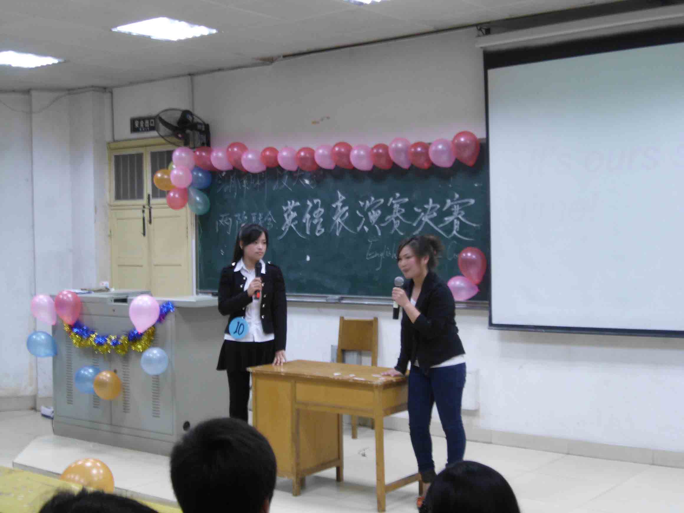 第二轮团体表演中,A组由曾美蓉、陈欢等带来诗歌朗诵《Time to say goodbye》,B组由谭梦梦等带来歌曲串烧,C组由卢萍等表演了《Chinese idol》。最终,我院卢萍及其搭档以《Hello,甄嬛》获得一等奖,易丹、陈欢获得二等奖,曾美蓉、杨欢等获得三等奖。