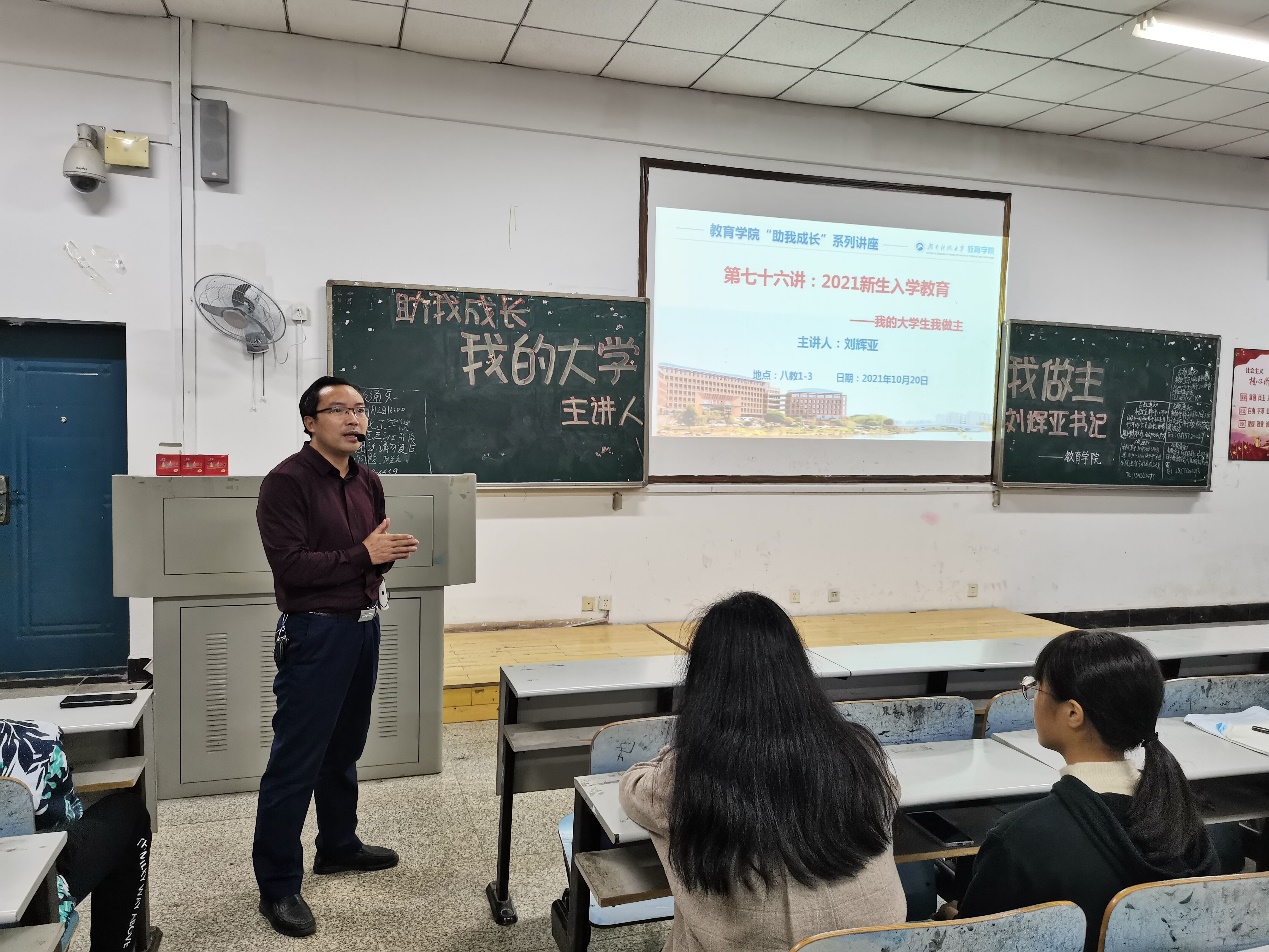 10月29日晚上7:00,“助我成长”第七十七讲——21级入学教育讲座“我的大学我做主“在第八教学楼1-3教室顺利召开。本次讲座由教育学院党委副书记刘辉亚主讲,21级全体新生参与。