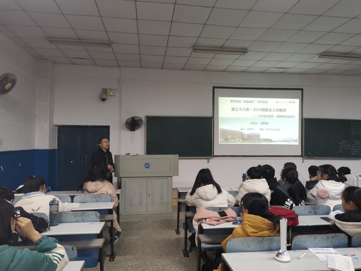 展望未来,助我成长,教育学院新生入学教育课持续推进。2019年12月2日19:00,在第八教学楼1-3教室,教育学院党委副书记刘辉亚为2019级新生上了一堂精彩的入学教育课,主题为“让毕业后的你,感谢现在的自己”。