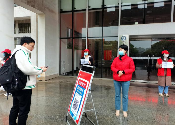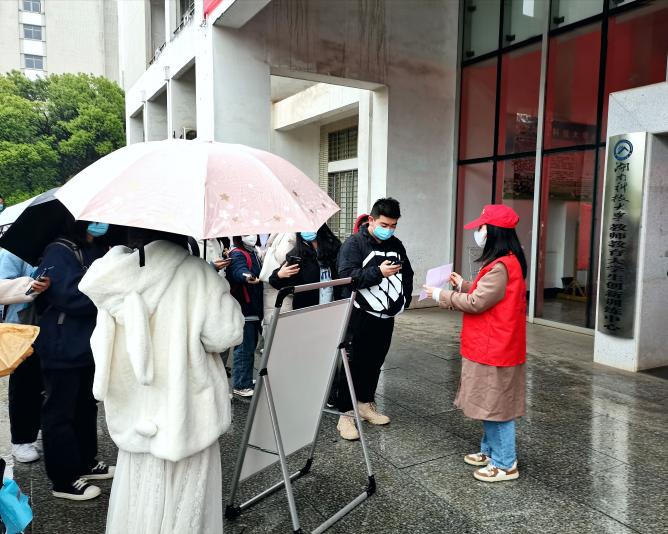 “请大家提前把手机打开,扫场所码进入八教”...根据我校疫情防控实际,3月21日起,恢复健康状况良好同学的线下教学工作。为妥善安排“线上”与“线下”的有序无缝衔接,我院连夜招募多名志愿者以协助第八教学楼后勤人员组织同学们有序扫码进入。3月21日清晨,冒着蒙蒙细雨,我院第一批志愿者在第八教学楼门前集结,组织同学们有序扫码进入教学楼,为保障师生的健康安全,贡献自己的力量。教育学院学生疫情防控工作仍在持续。
