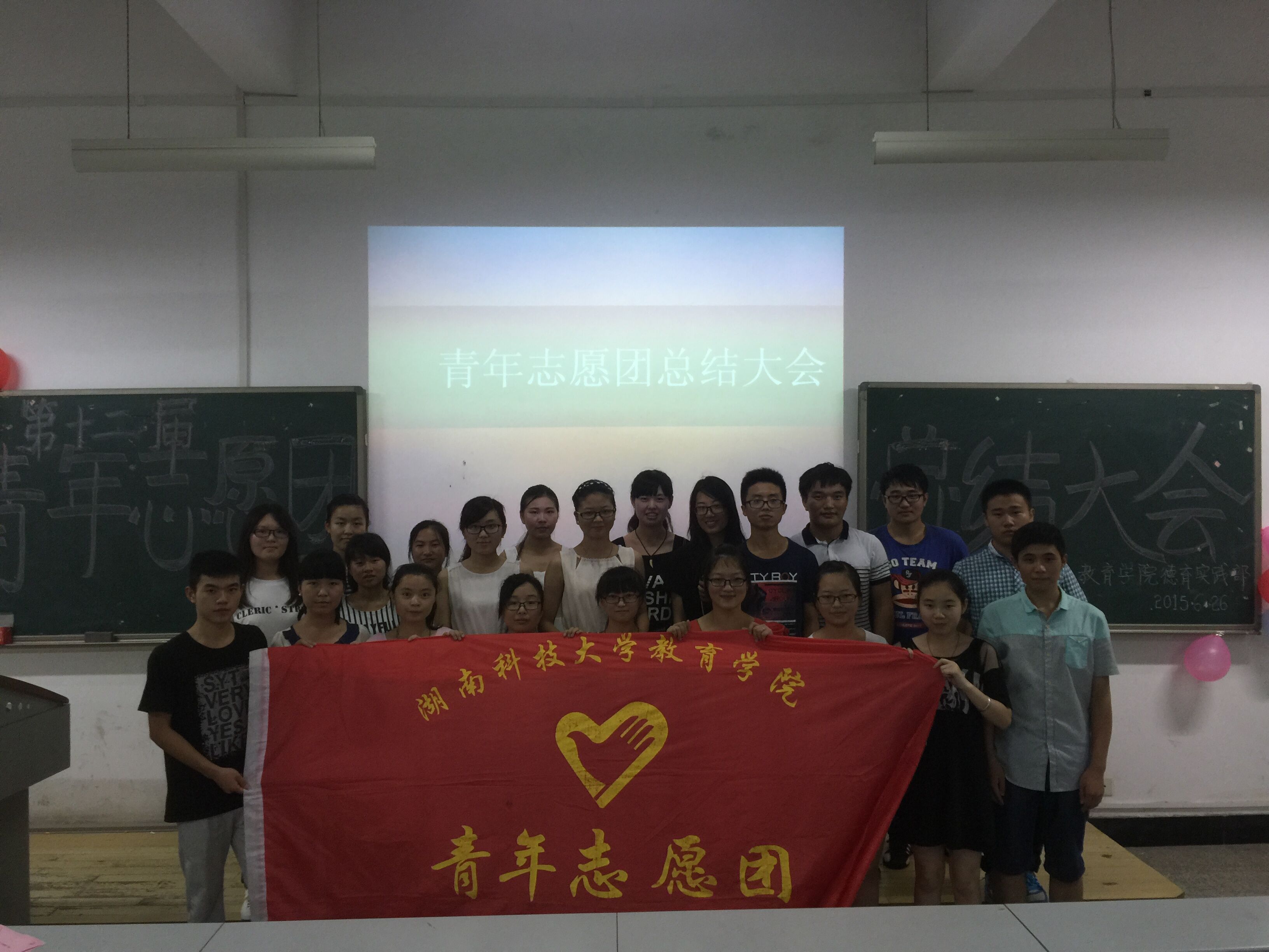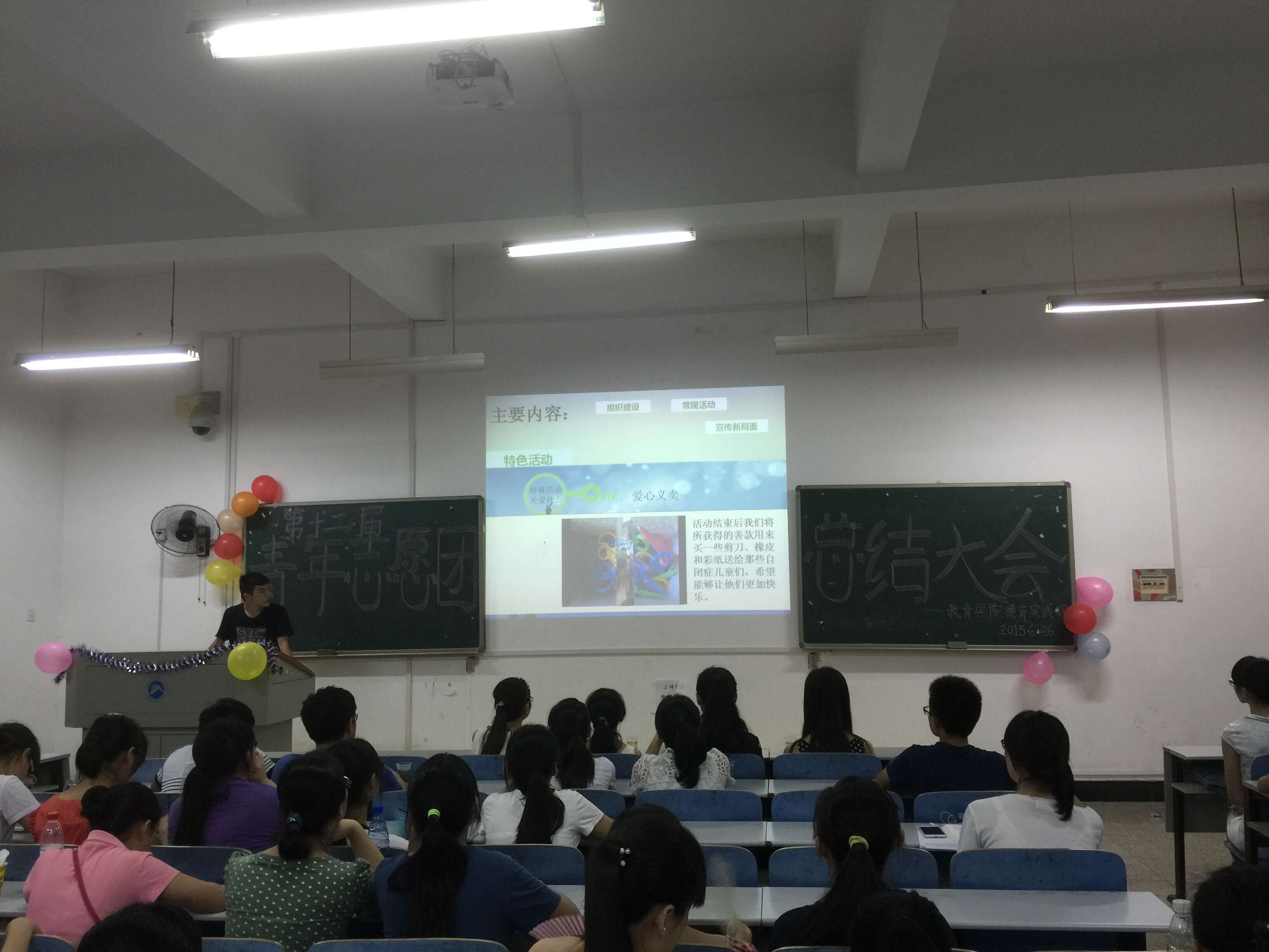 2015年6月26日19:30,教育学院第十二届青年志愿团总结大会在八教2―1举行。与会嘉宾有:教育学院团委学生会第一副书记徐春菊,副主席兼综合管理部部长张丹,副主席兼危机干预部部长肖雨薇,副主席兼就业服务部部长杨柠瑶。