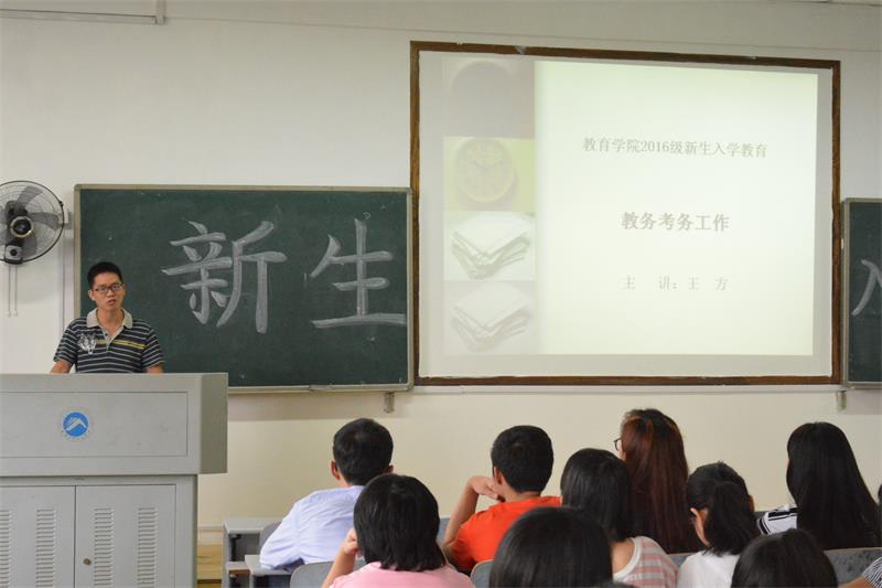 一路艰辛跋涉,一路满怀希望,在这个凉爽的好季节,有一群新的面孔怀着新的喜悦、揣着新的憧憬、带着新的追求,走进了朝气蓬勃的新校园,开启了人生中一个崭新的起点。而为了帮助新生更好地了解学校,更快地适应新生活,2016年9月11日8:30教育学院在第八教学楼4—3教室召开了16届新生的第一个大会——新生入学教育。出席本次大会的成员有学工办主任兼16级辅导员李涛老师、教务办王方老师、团委学生会主席团成员、新生助班以及全体16届新生。