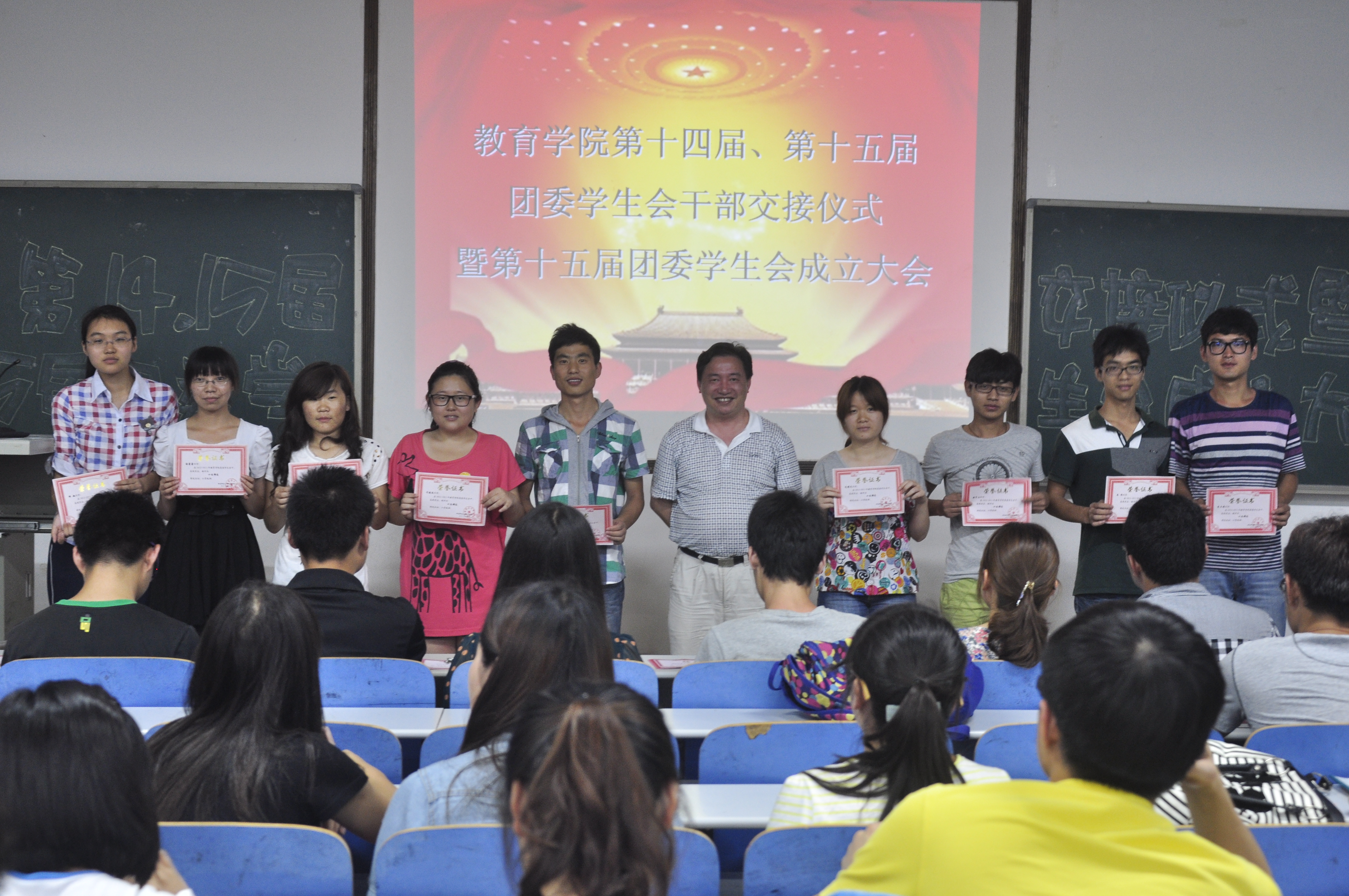 2013年6月8日19:00,教育学院第十四、十五届团委学生会干部交接仪式暨第15届团委学生成立大会于八教2-3召开。此次大会的嘉宾有,党委副书记王伟清教授、学工办辅导员胡银华老师、尹琼芳老师、练素华老师、兄弟学院团委学生会代表以及党建会代表。