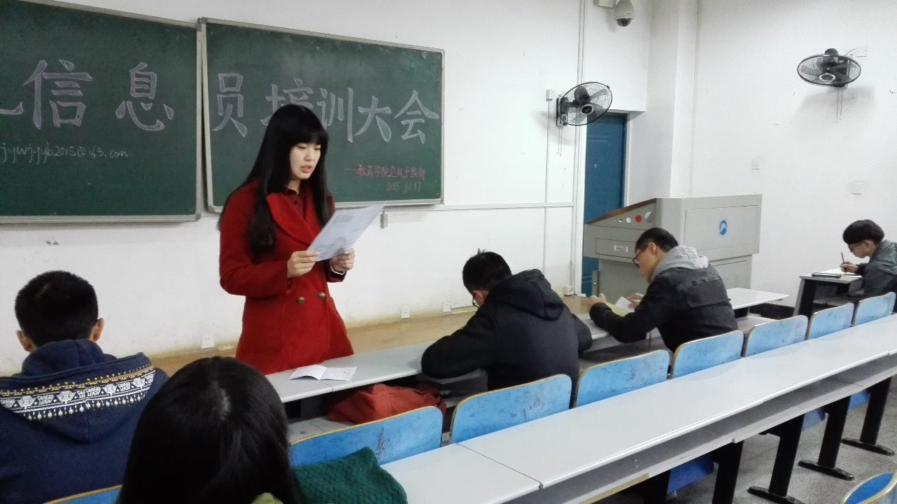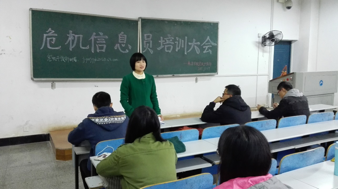 为了响应学校心理健康工作的改革方案。教育学院危机干预部在2015年11月17日于八教1-4组织召开了12、13、14、15级所有危机信息员的培训大会,这是本学期以来的第二次大型会议。本次会议主要讲解了新的工作安排,解决了危机信息员在工作中遇到的问题,了解了各级各班危机信息员的工作情况。出席本次会议的有:教育学院心理辅导员老师练素华、团委学生会副主席兼危机干预部部长肖雨薇同学、以及危机干预部的全体成员。会议由危机干预部部长主持召开。