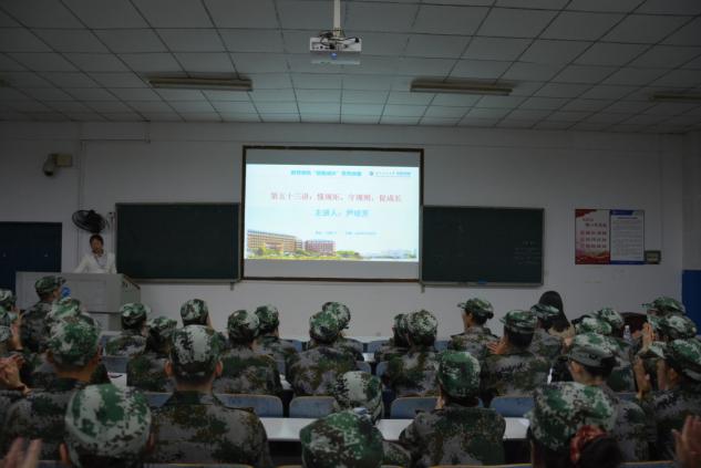 讲座伊始,尹琼芳从新生高中时期最常听到的那句“到了大学你想怎么玩就怎么玩”为切入点,指出其中的逻辑错误,并告诉新生,大学是人生的一个新的起点,大学应该比高中更加充实、更加努力。随后,她通过对比中学和大学管理模式的不同,着重强调了自律和他律的重要性。围绕“没有他律,难以成长成材”,尹琼芳从管理方法、管理内容、日常管理制度三方面为大家全面解读了学院的管理机制基本要求,重点介绍了课堂考勤、晚自习、晨跑、晨读、卫生、晚归的检查流程和违纪处理方法等,使新生在愉悦轻松的氛围中对我院的管理规章制度有了进一步的了解。为更好配合学院管理工作的进行,她对新生提出几点要求:培养自律能力,把学习当作主要任务;主动沟通,有事提前沟通;突发和特殊情况,事前给老师短信请假,事后及时补纸质假条。最后,尹琼芳勉励新生多一些自律,少一些自由;多一些规矩,少一些任性;多追求知识,少寻求娱乐。讲座在新生的掌声中落下帷幕。