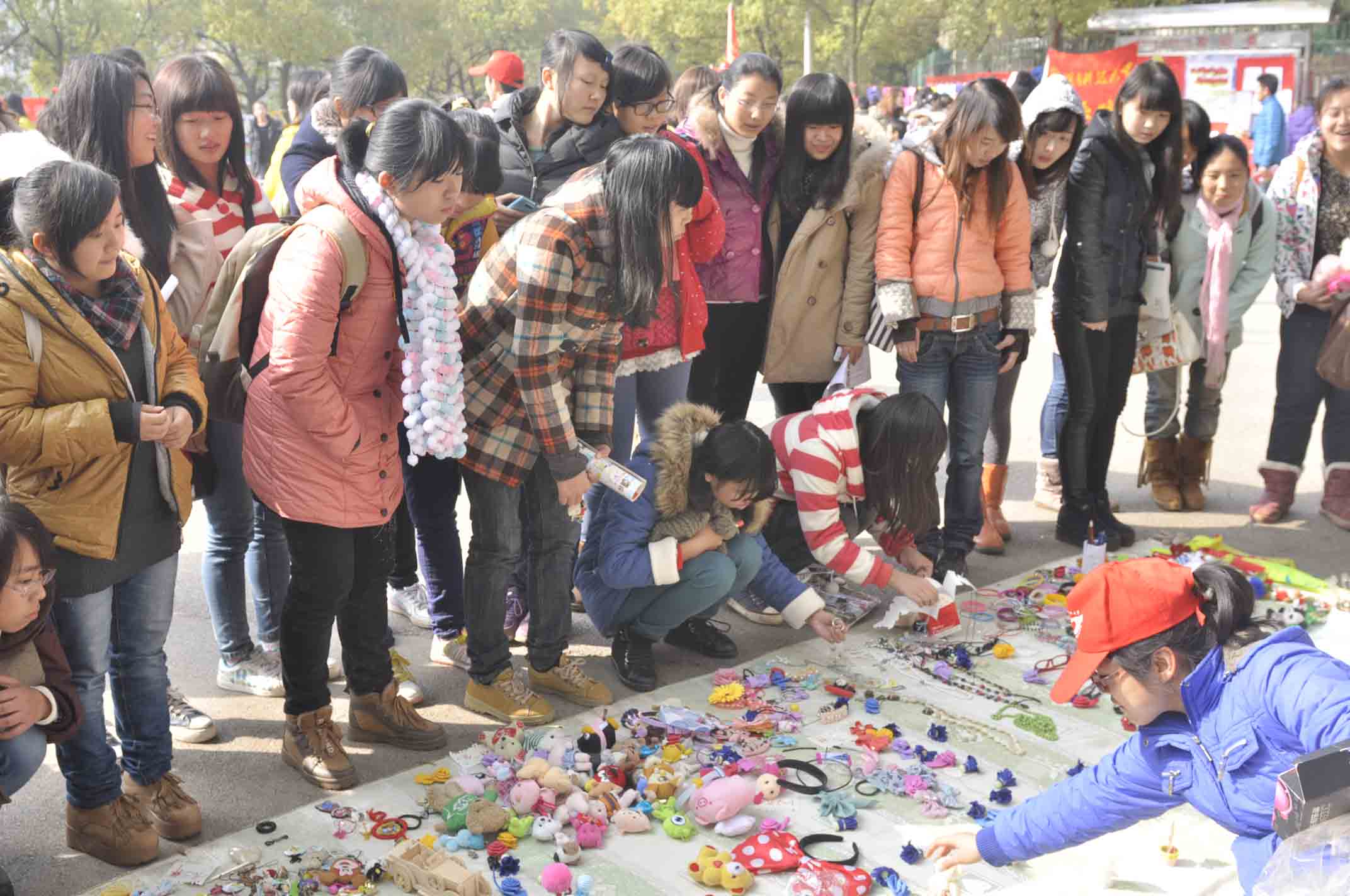 此次义卖的物品是志愿者们深入到各个宿舍,向同学们募捐得来的,包括各种毛绒玩具、小饰品、书本等,他们把义卖物品定到合适的价位,整齐的摆在地上。志愿者们热情的向路过的同学推销义卖物品,积极劝说路人为自闭症儿童献一份爱心并组织起多样形式的募捐活动。同学们除了可以购买义卖物品,还可以参加套圈小游戏,这种趣味性的募捐活动吸引了许多同学的目光,同学们也纷纷捐出了自己的一份爱心。在写着“因为有我在,世界不孤独”的条幅上,也布满同学们的签名。