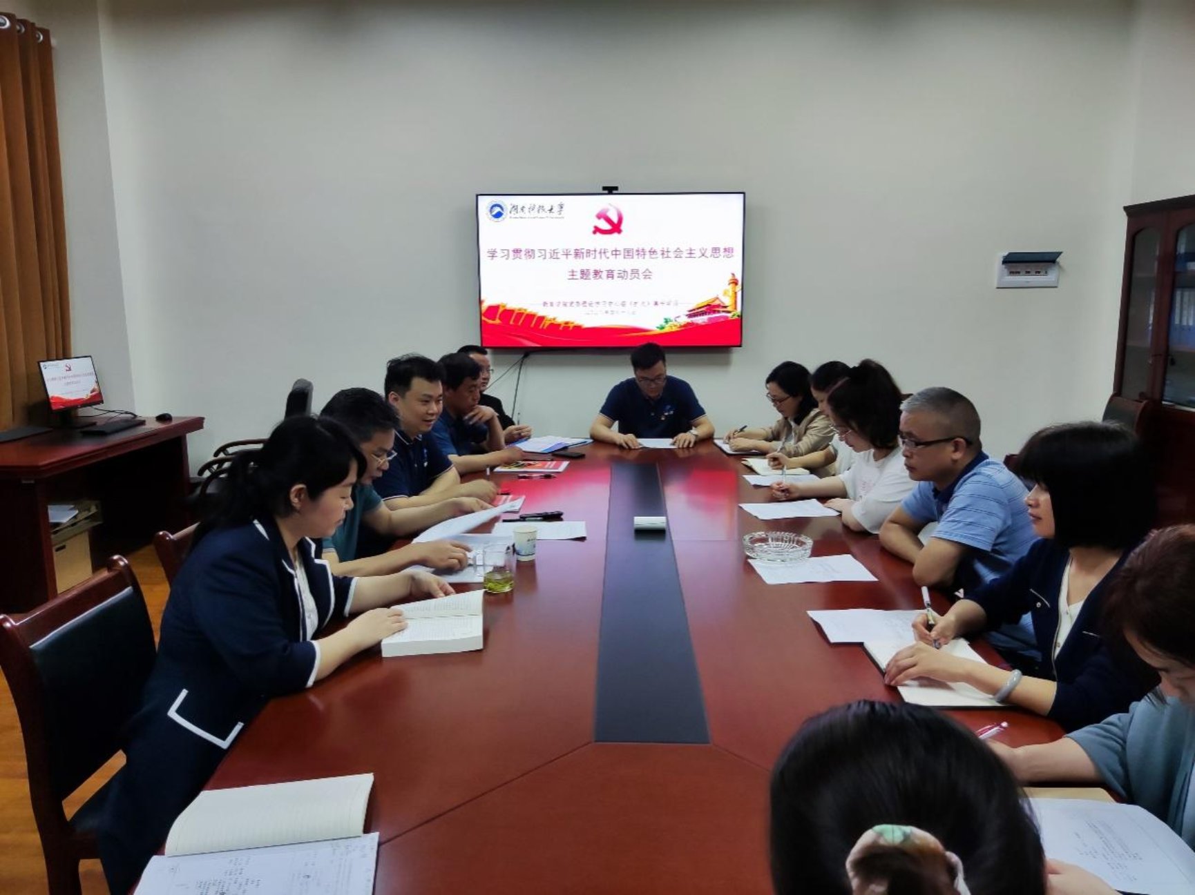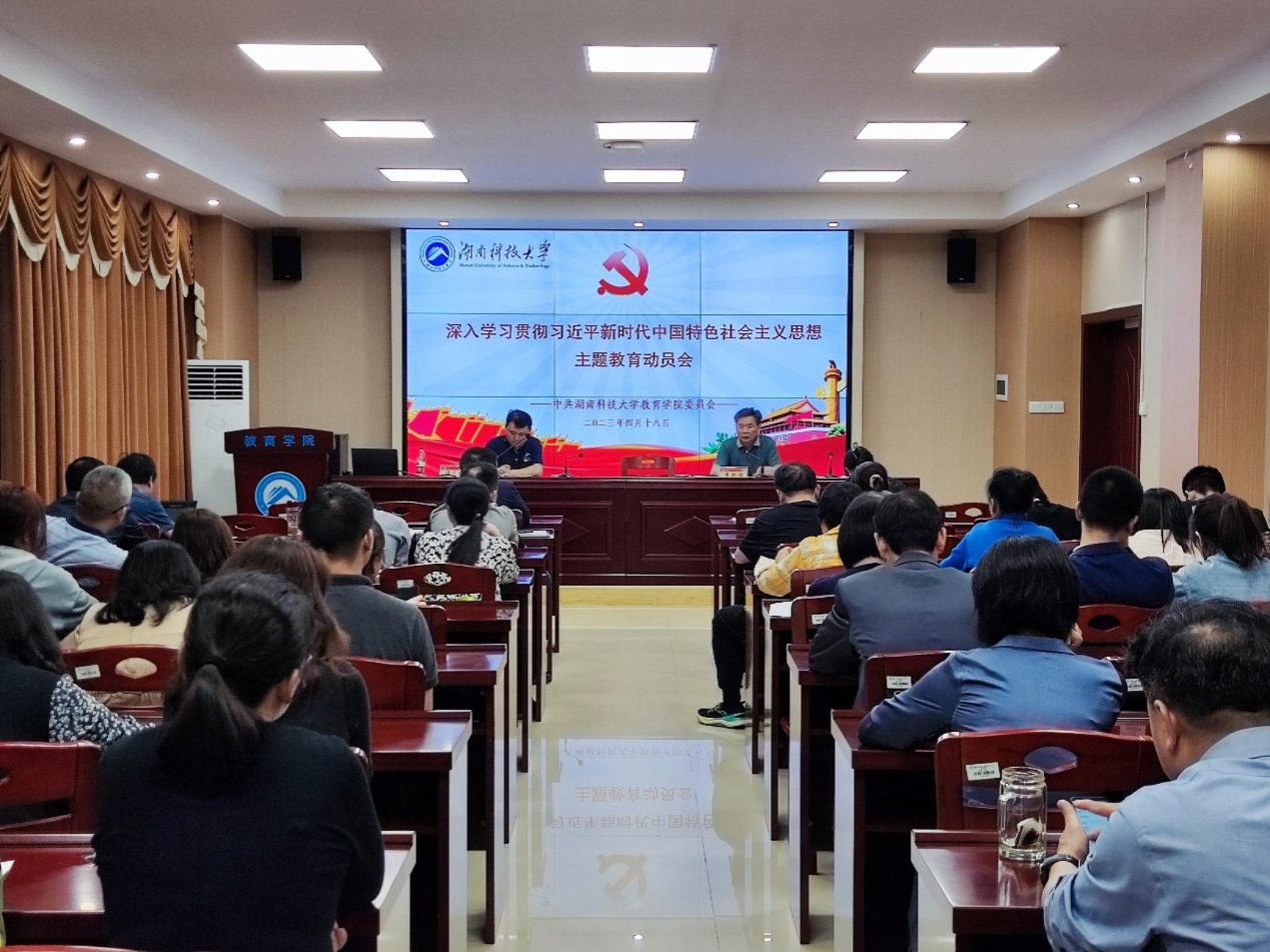 第一阶段,党委书记李炳煌在敏行楼A333主持召开主题教育动员大会,全体教职工参会。李炳煌组织学习了党中央、省委主题教育工作会议精神,传达了夏智伦厅长在委厅主题教育工作会议上的讲话精神以及唐亚阳书记在湖南科技大学学习贯彻习近平新时代中国特色社会主义思想主题教育动员大会上《加强党的创新理论武装 为建设高水平综合性大学而团结奋斗》报告精神。李炳煌指出,要充分认识开展主题教育对推动全党深刻领悟“两个确立”的决定性意义、坚决做到“两个维护”的重大意义,深刻认识开展主题教育是贯彻落实党的二十大精神的重大举措、是加快建设教育强国的迫切需要、是推进新时代党的建设新的伟大工程的重大部署。全体党员干部应切实把思想和行动统一到习近平总书记重要讲话精神和党中央决策部署上来,以高度的政治自觉、饱满的政治热情、严肃的政治态度,积极投身主题教育,确保取得实效。全体教职工要立足岗位,落实立德树人根本任务。