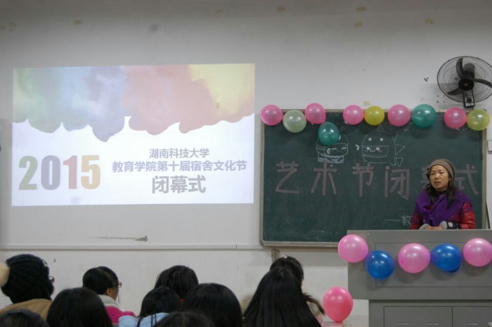 2015年12月16日,这个寒雨初霁,冬阳送暖的日子里,经过一轮异彩纷呈的寝室文化作品评选,由湖南388vip太阳集团纪检宿管部承办的教育学院寝室文化节划上了一个圆满的句号,闭幕式于当天19:00在第八教学楼1--2教室顺利进行。莅临仪式的嘉宾有湖南388vip太阳集团党委副书记王伟清,湖南科技大学心理健康咨询室的尹琼芳老师,教育学院学工办主任李涛老师,及教育学院团委学生会主席团全体成员。