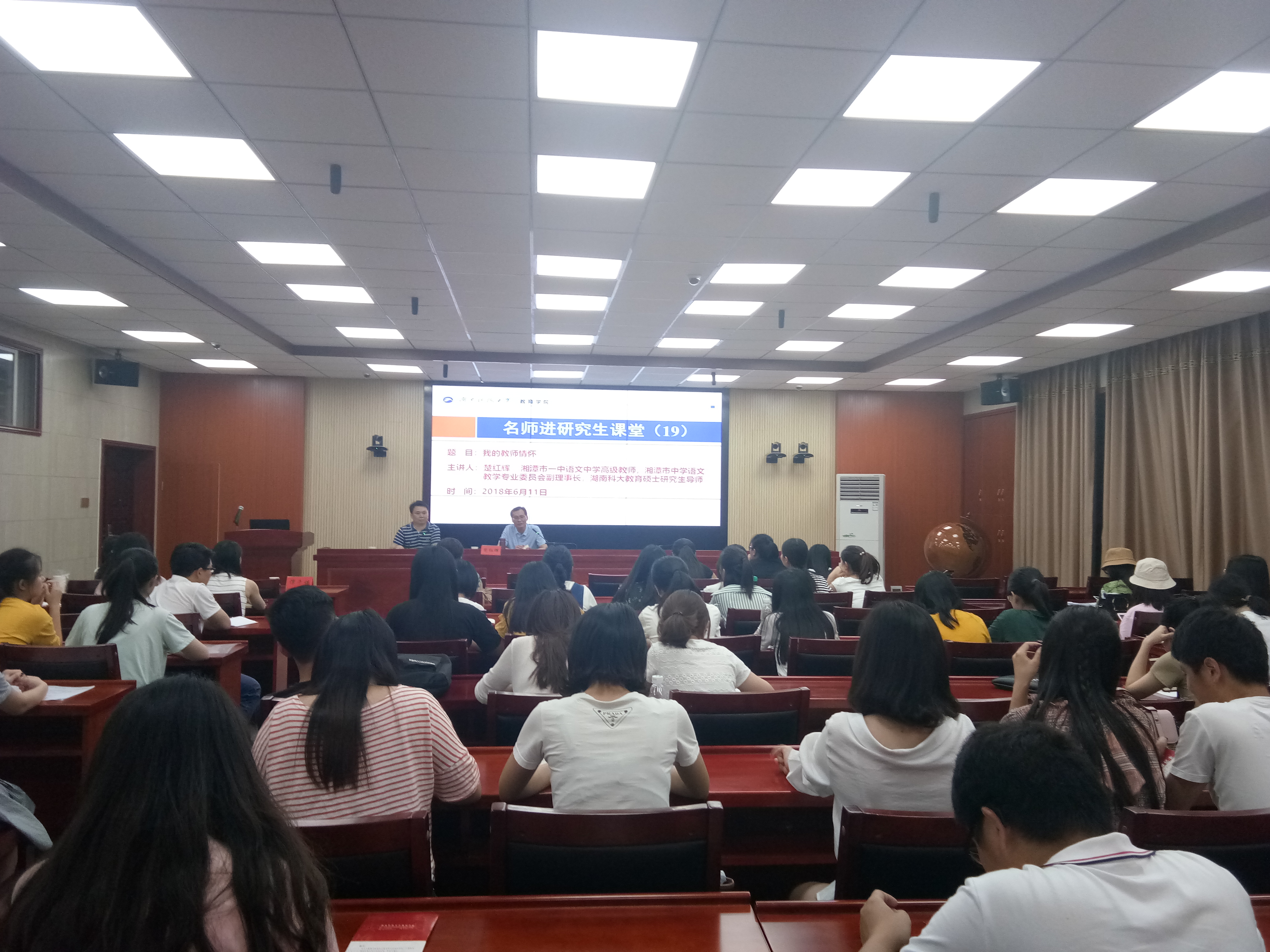 2018年6月11日19:30,湘潭市一中语文中学高级教师楚红辉在八教308报告厅为我院师生带来了题为《我的教师情怀》的讲座,教育学院教师代表、教育硕士专业研究生代表参加了本次讲座,讲座由教育学院副院长谭千保主持。