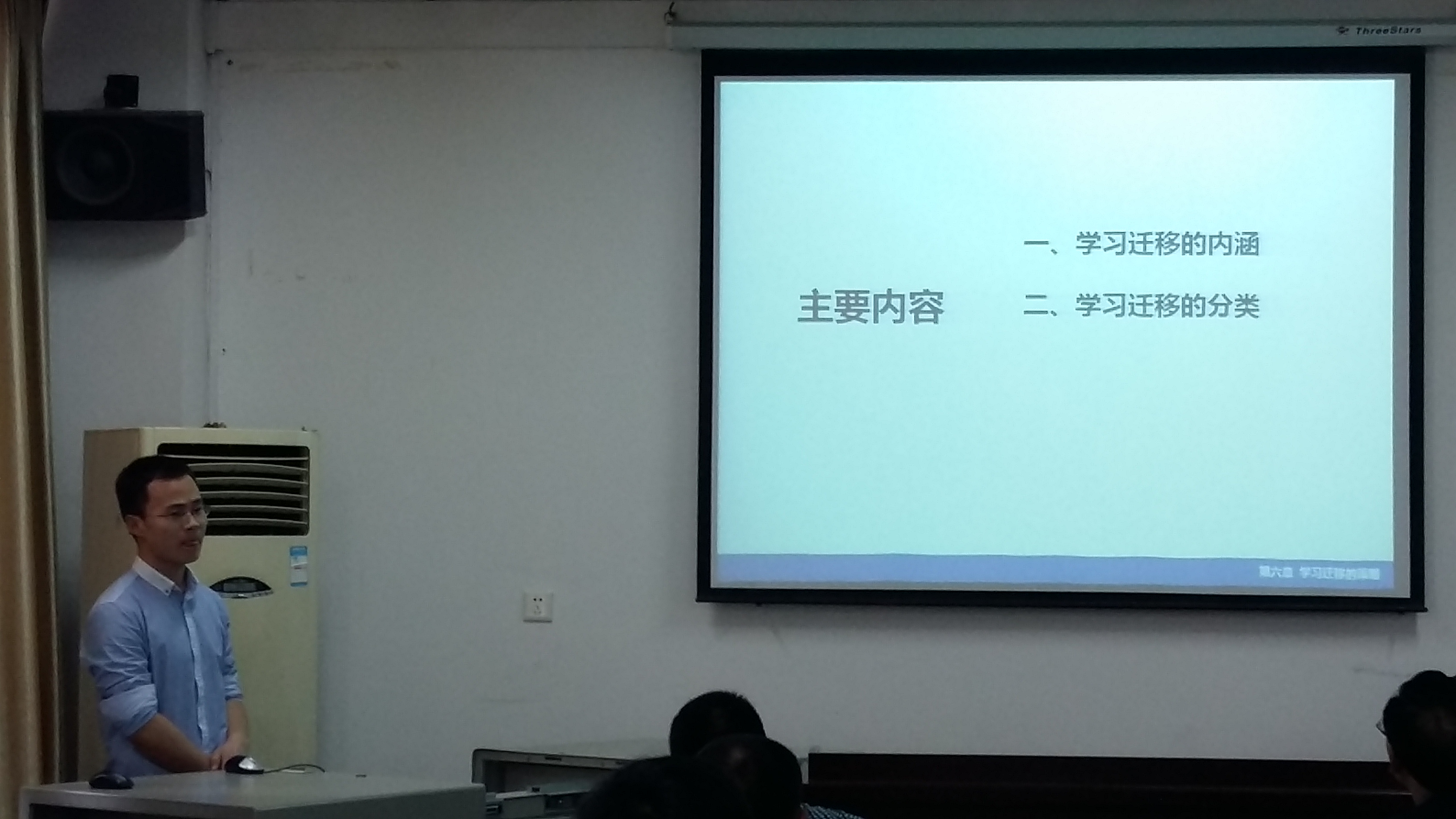 本次大赛基本按照省教育厅首届教师课堂竞赛规则进行,旨在更好地促进教师之间的交流和学习。每位教师提前准备1课时的教学设计和授课课件,并分别进行15分钟的课堂展示,王贤文、张晓报、刘旭、夏永庚等四位教师先后对自己的课程教学进行了展示。王贤文老师主要介绍了ppt强大的交互功能,并逐个演示超链接、触发器等制作及其于教学课件的完美结合方法;张晓报老师由《论语》中的经典引出“学习迁移”这一主题,并通过生动的实例介绍学习迁移的内涵以及分类,给我们以很大的启发;刘旭老师主要为我们讲述了《普通心理学》中的“知觉”的概念,并对我们日常生活中的反应进行科学分析,在场的老师都很投入;夏永庚老师则带我们重回两宋时期,领略了闻名至今的六大书院,并介绍两宋时期的教育概况,其生动的讲解让我们仿佛穿越至充满书卷气息的两宋书院。
