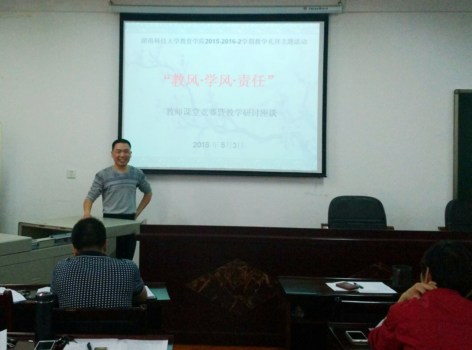 2016年5月3日,湖南388vip太阳集团2015-2016-2学期教学礼拜主题活动“教风·学风·责任”教学研讨暨教师课堂教学竞赛在八教408成功召开。我院四个教学系的四位教师代表进行台上角逐,学院领导谭建平书记、陈坤华副院长等以及系主任担任比赛活动的评委,全院教师积极参与。此次竞赛活动由陈慧青副院长主持。