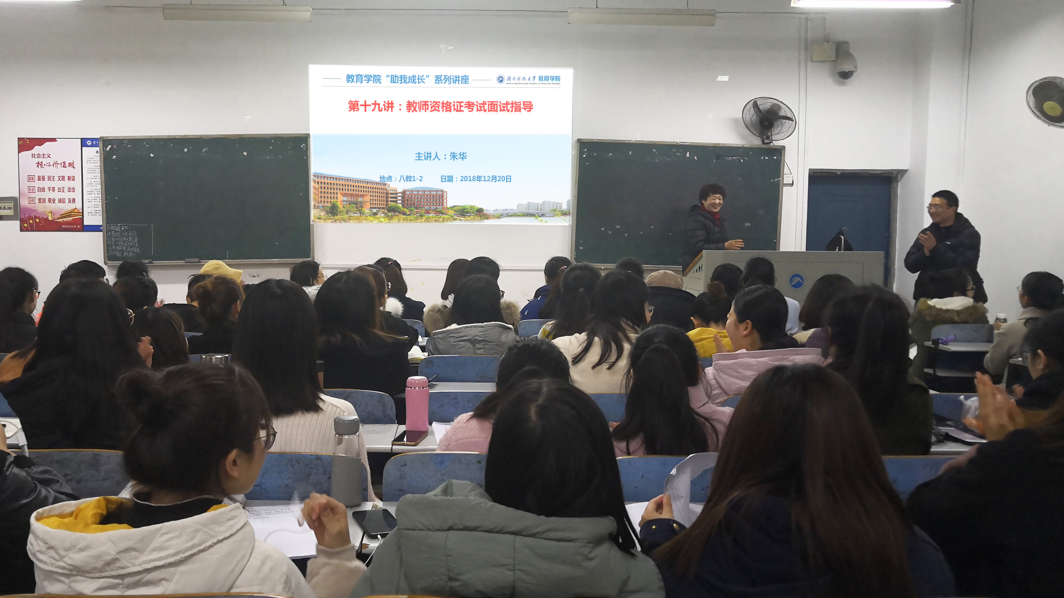 为更好地了解教师资格证面试流程,提升我院学生应试技巧与能力,提高我院学生教师资格证面试通过率,教育学院于2018年12月20日19:00在八教1-2举行“助我成长”系列讲座第十九讲——教师资**面试指导。此次讲座由我院李炳煌老师(湖南省教师资格证面试首席考官)、朱华老师(湖南省教师资格证面试考官)主讲,16级教师资格证笔试通过的全体学生参加。