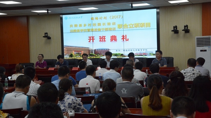 7月23日上午,由教育学院承办的国培计划(2017)乡村校长培训之炎陵县乡村校园长专题培训班(E503)和沅陵县学校管理后备干部培训班(E405)开班典礼在教育学院学术报告厅隆重举行。副校长周飞跃,继续教育学院副院长刘晓平,教育学院院长李海萍、副院长谭千保、副书记刘辉亚,以及国培计划沅陵县和炎陵县两县学员共计80名校长、园长、学校管理后备干部学员参加开班典礼。教育学院党委书记李炳煌主持开班典礼。