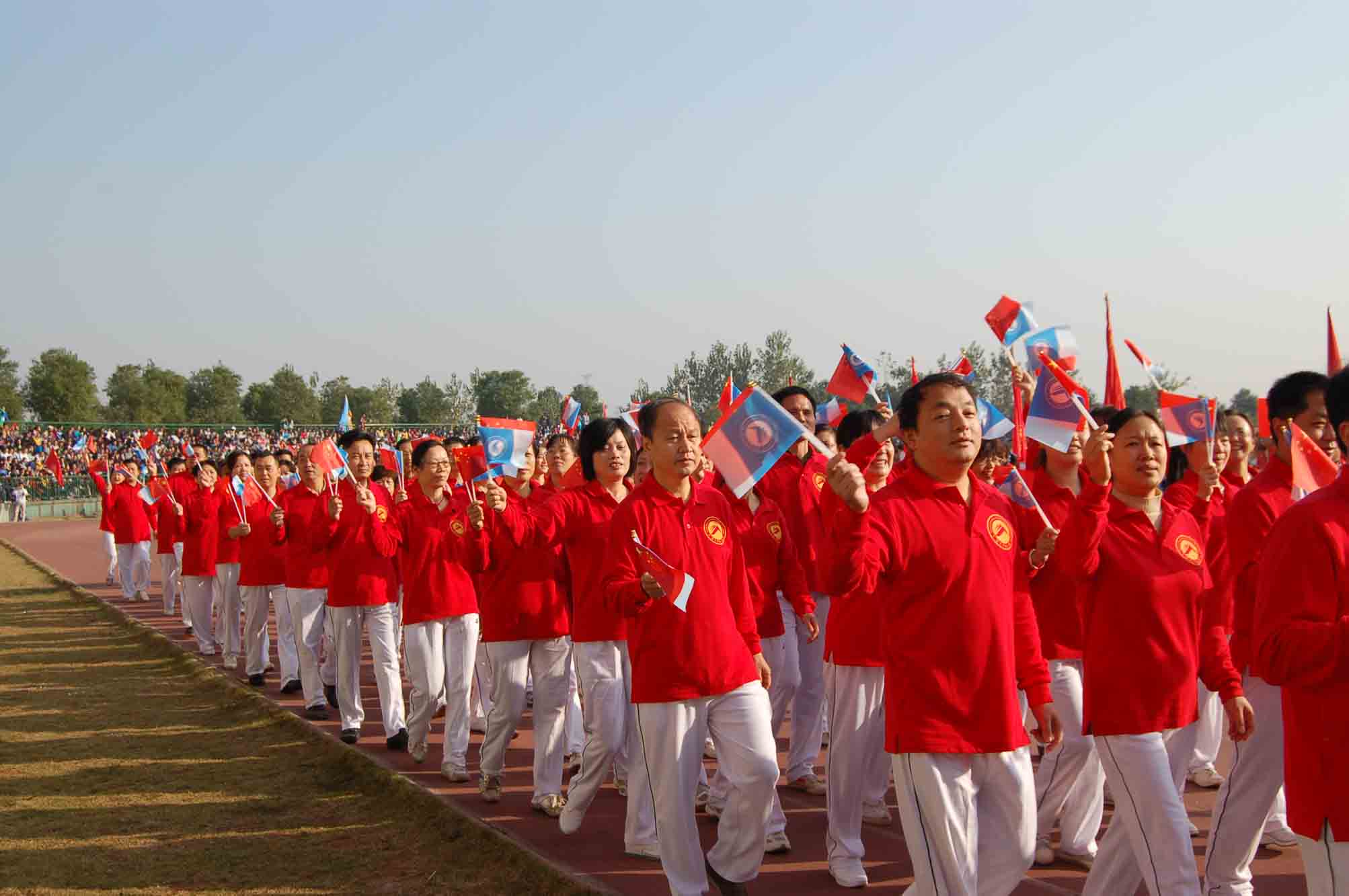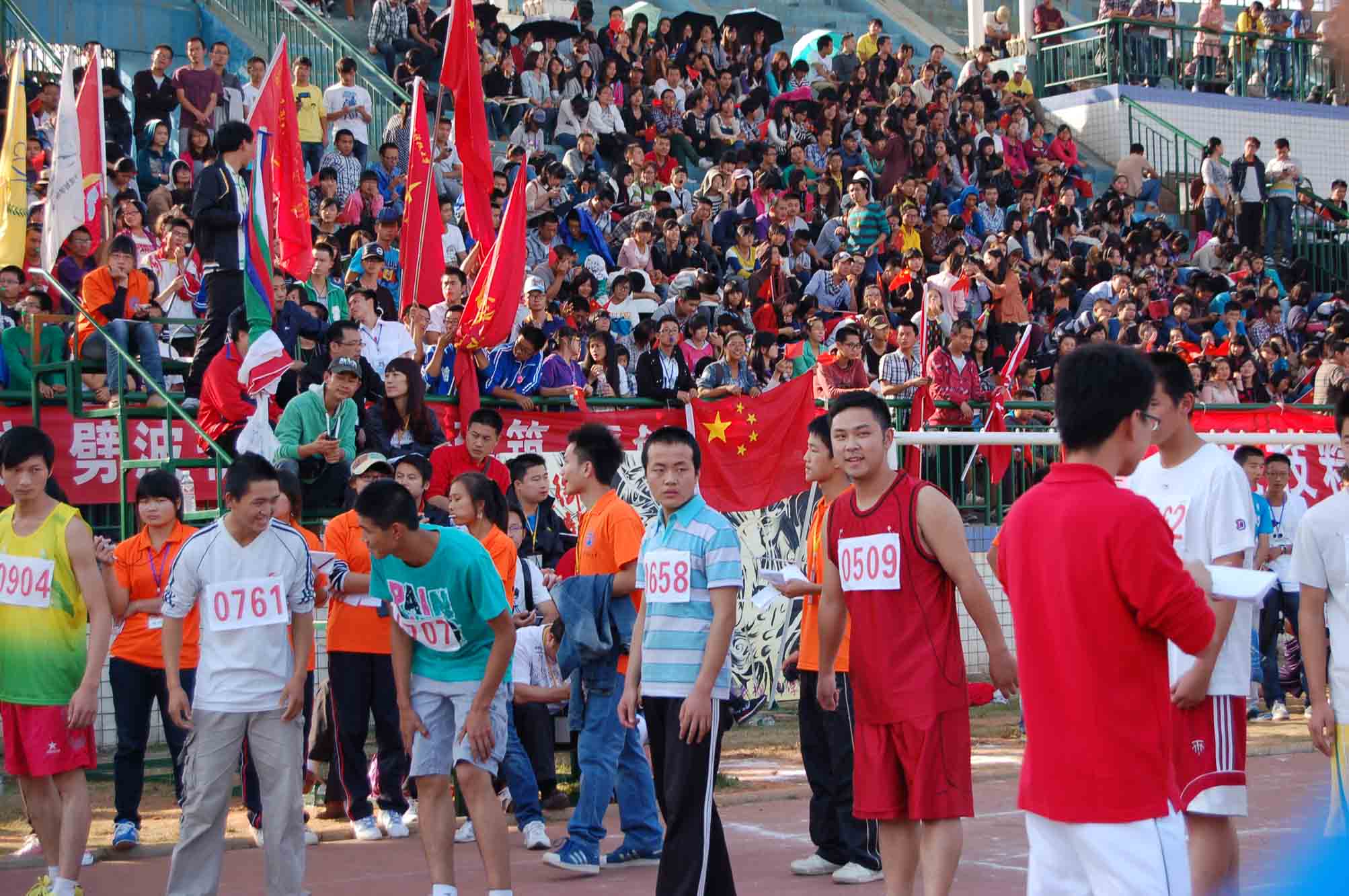 各学院方阵队一出,啦啦队们便慷锵有力喊出自己学院的口号,顿时,全场一片沸腾。是外国语学院的“女儿当自强”,是商学院的鼓声阵阵,是教育学子的巾帼不让须眉,一排排身着着粉红色上衣的教育学院女子方阵队从主席台走过时,教育学院的整个看台炸开了花,彩旗飘扬,哨声连连,欢呼雀跃,掌声不断,更有震耳欲聋的鼓声和整齐的呐喊声“教育学院,勇攀高峰,驰骋科大,树我雄风。”这不仅是教育学子的声音,更是这一群群科大人为体育精神的呐喊。