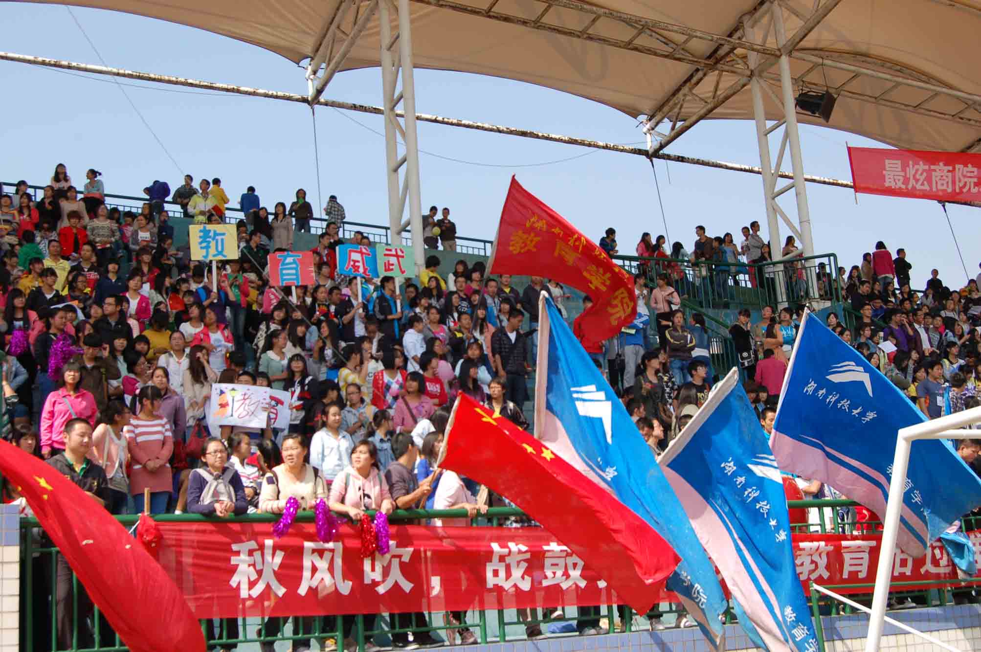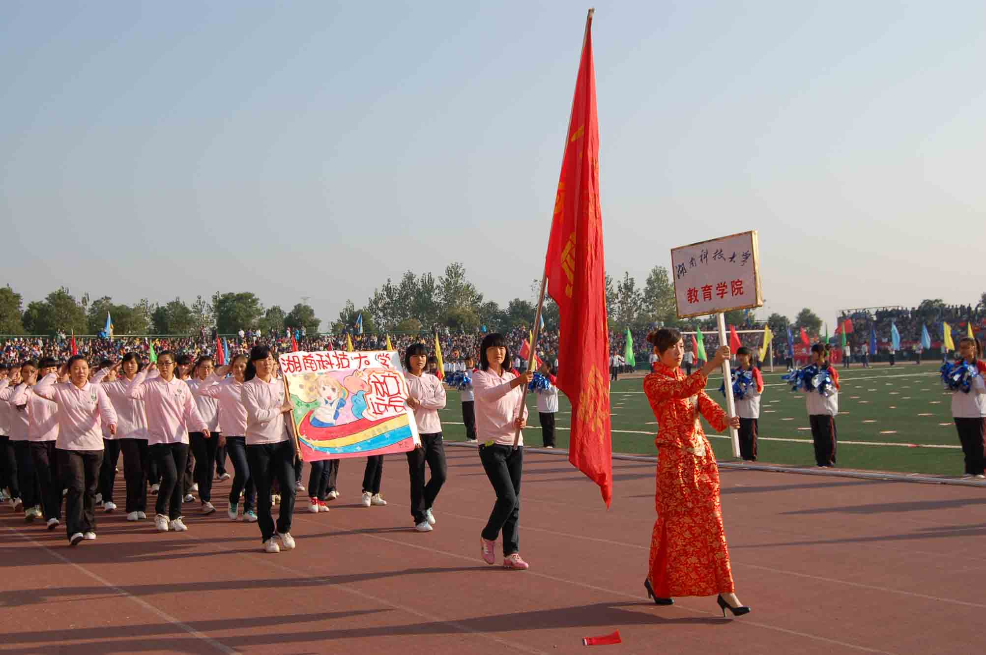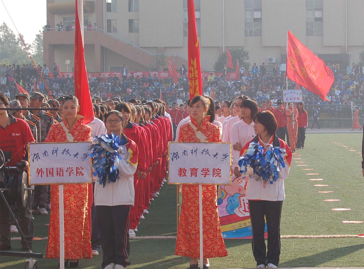 金秋湖湘,秋高气爽;科大轿子,共庆盛会。2012年10月18日上午8时,湖南科技大学秋季校运会开幕式在新田径场隆重举行。 在校旗方阵队的带领下,鲜花方阵队和彩旗方阵队将整个体育场装扮得焕然一新,在一片温馨的海洋中,各学院方阵队依次有序地从主席台前走过,接受领导们的检阅。