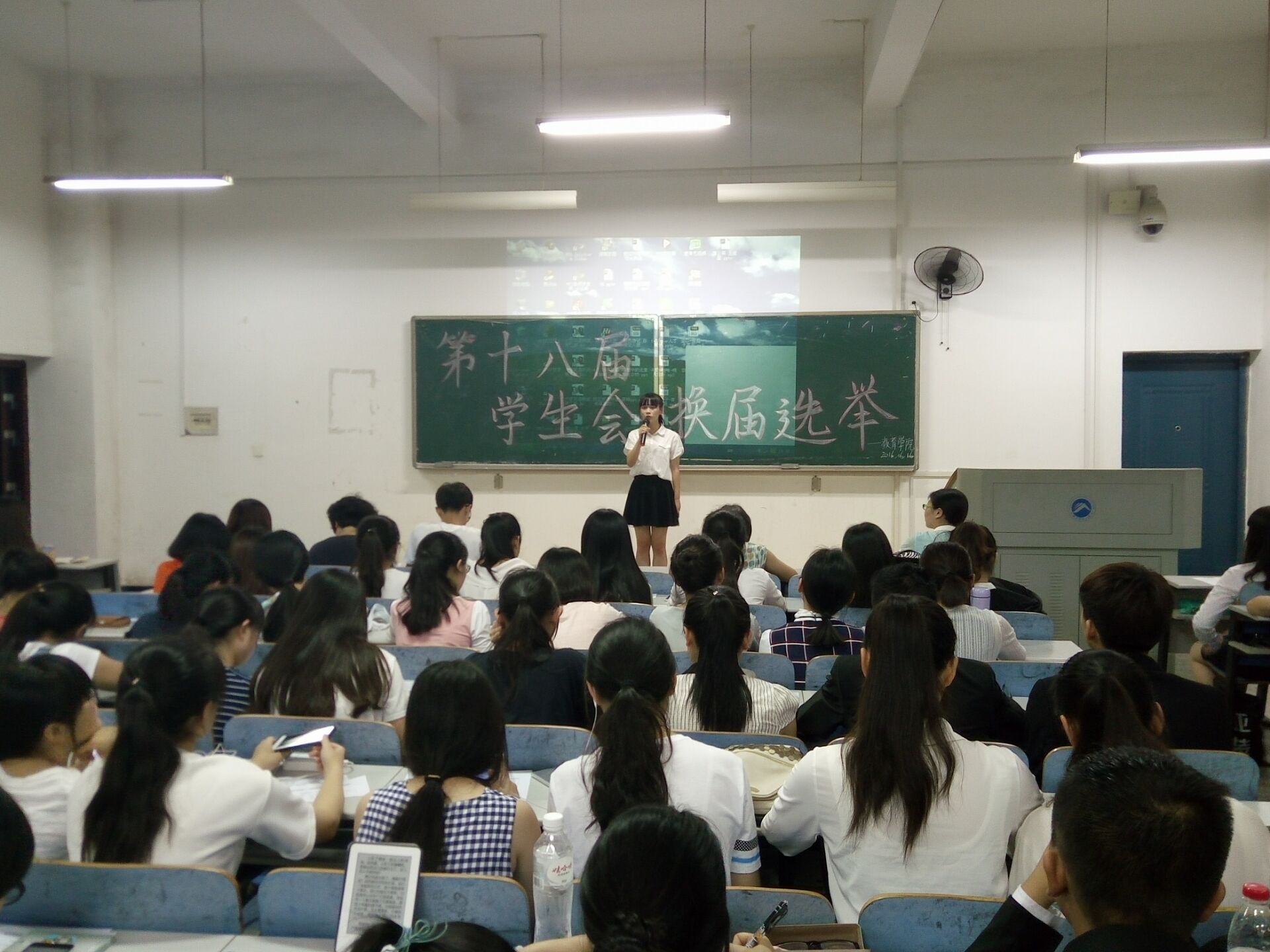 换届选举大会伊始,由练素华老师为此次选举做了讲话,她希望所有候选人都能够正确的对待换届竞选,竞选成功的同学要继续努力,没有成功竞选的同学也要放平心态,人生还有更大的舞台,另外她也指出希望每一个手握选票的同学都能公平公正的投票。随后主持人宣布比赛注意事项竞选便正式开始。此次换届选举实行差额选举制度,每个候选人有2-3分钟的演讲时间,由在场的观众根据他们的表现投出自己宝贵的一票,现场公布竞选结果,保证比赛的公平公正公开。