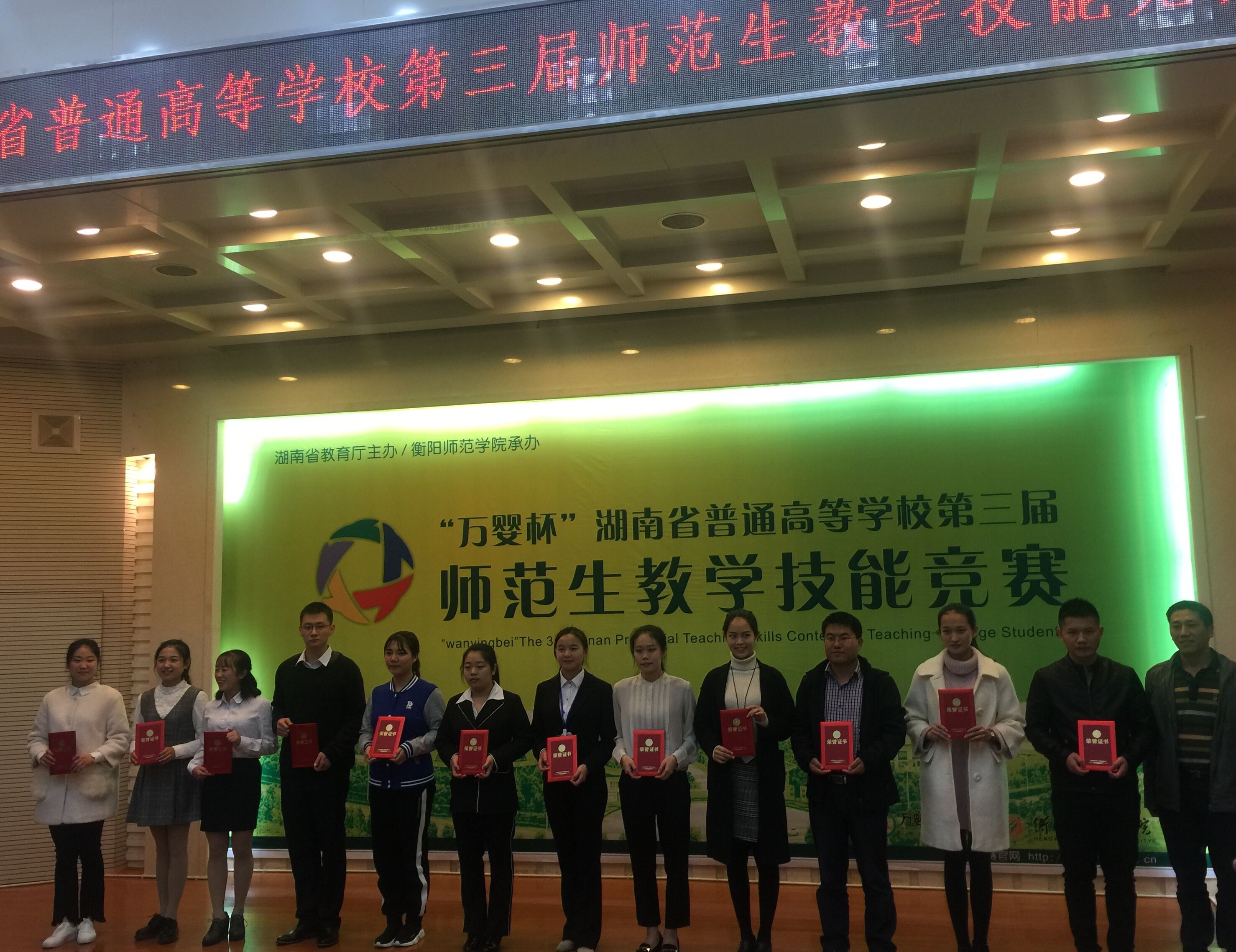 2017年11月11日,“万婴杯”湖南省普通高等学校第三届师范生教学技能竞赛在衡阳师范学院落下帷幕。本次比赛,我校校本部和潇湘学院共10名选手参加决赛,其中教育学院1名选手参赛。我校获得一等奖1名、二等奖2名、三等奖2名,其中教育学院孙弘宇同学获得二等奖。