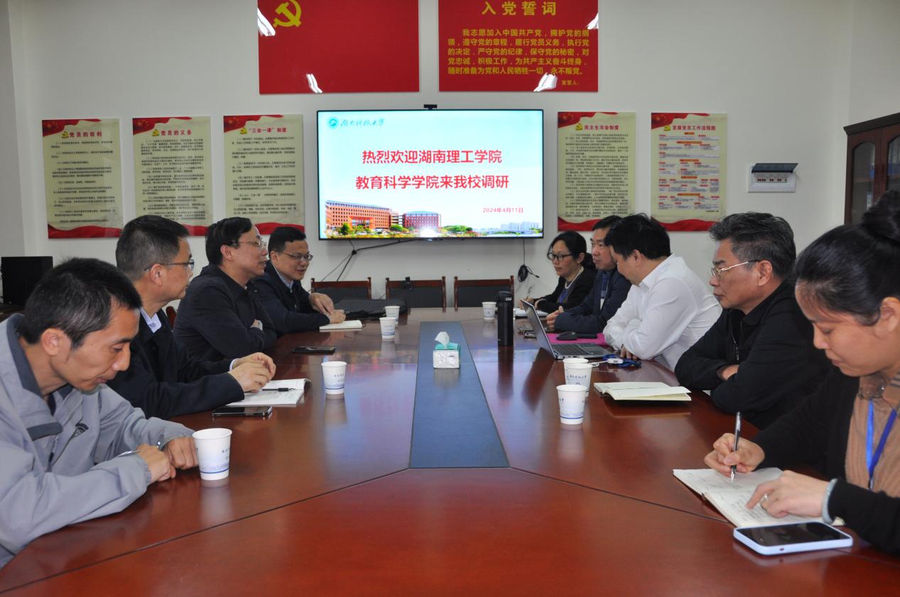 2024年4月11日上午,湖南理工学院教育科学学院院长刘理一行来我院调研交流。湖南388vip太阳集团院长谭千保、党委书记李炳煌、党委副书记文红梅、小学教育系系主任夏永庚、研究生工作办公室负责人张桂玉老师参加。