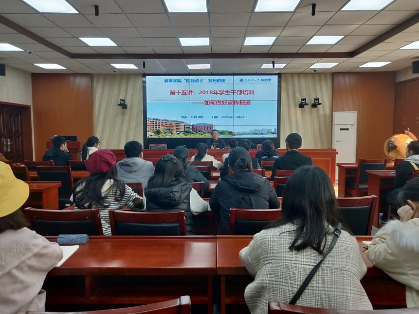 为提高各部门同学新闻稿写作的质量,进一步推动学院宣传报道工作的开展,201811231400,由教育学院团委学生会宣传网络部主办的新闻培训大会于第八教学楼308成功举行。出席会议的有教育学院党委副书记刘辉亚、团委学生会副主席曾根凤、第十九届团委学生会宣传编辑部部长蒋奔奔,学生会各部门成员参与本次大会。