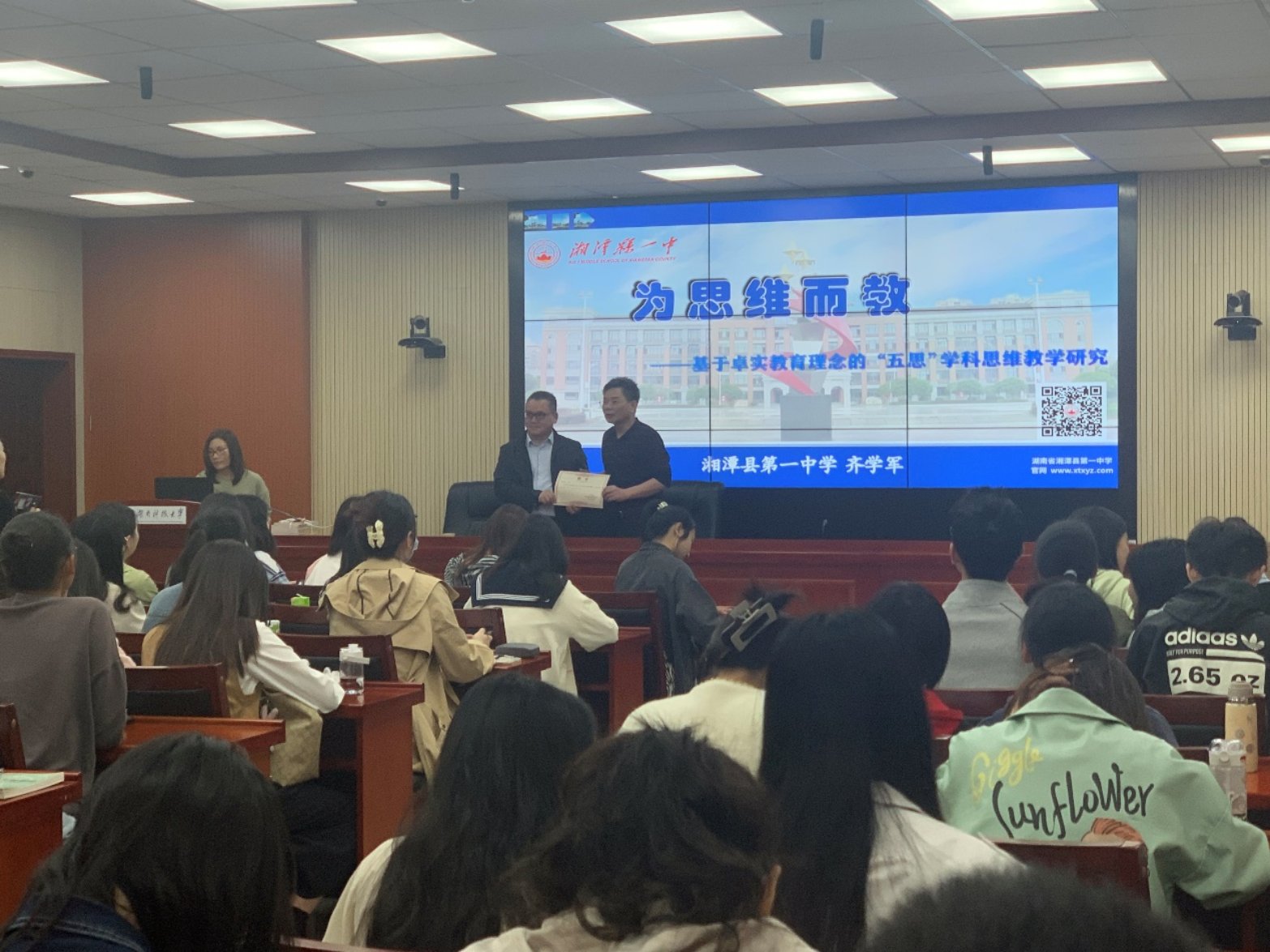 5月10日,全国五一劳动奖章获得者、湖南省特级教师、湘潭县第一中学党委副书记、校长齐学军应邀莅临我院,做客“躬行讲堂暨名师进研究生课堂”,在第八教学楼308学术报告厅,围绕课程思政与“五思”学科思维教学,为我院师生带来《为思维而教——基于“卓实”教育理念的“五思”学科思维教学研究》主题讲座。讲座由教育学院党委书记李炳煌教授主持,教育学院学术型硕士研究生、教育硕士专业学位研究生及本科生到场聆听学习。