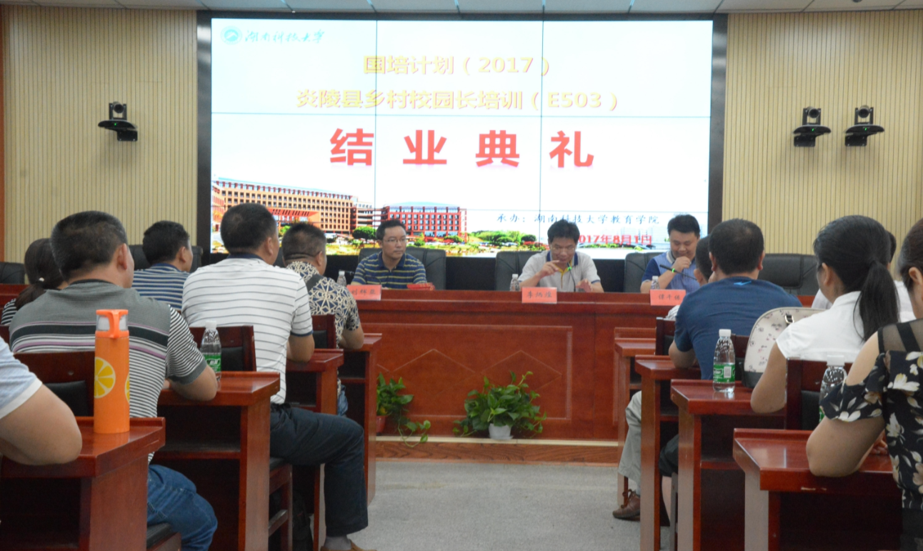 8月1日上午9点整,“国培计划(2017)”---湖南省炎陵县乡村校园长培训班(E503)结业典礼在第八教学楼304会议室举行。结业典礼由李炳煌书记主持。湖南388vip太阳集团副院长谭千保、副书记刘辉亚、国培办主任马培锋、相关管理服务团队工作人员和来自湖南省株洲市炎陵县的40名学员参加了结业典礼。