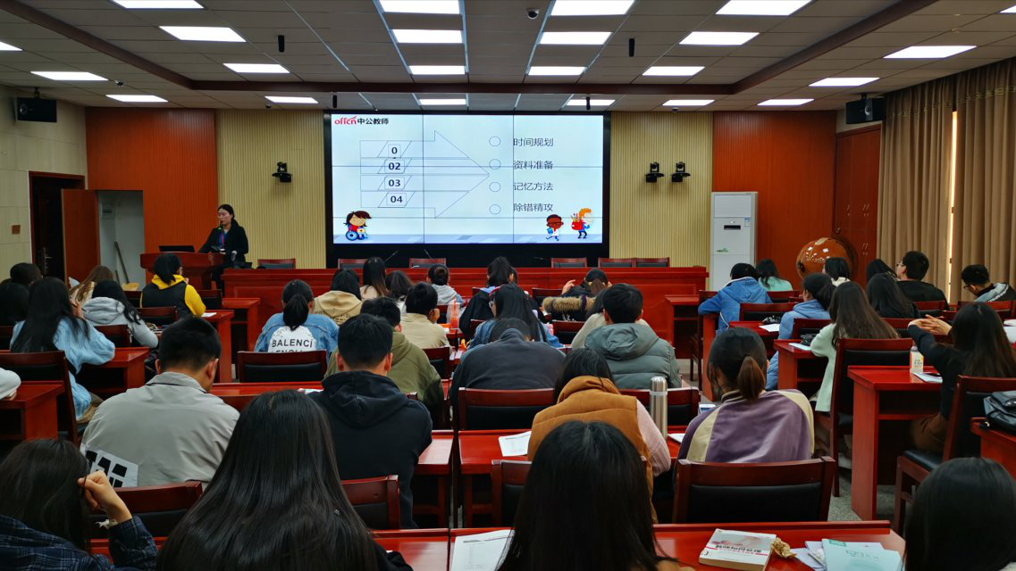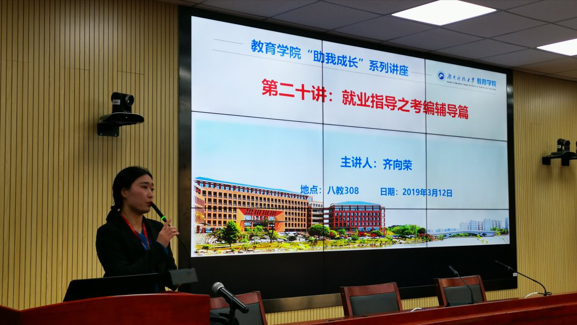 2019年3月12日14点,教育学院特邀中公教育金牌讲师齐向荣作为主讲嘉宾,在第八教学楼308会议室为我院学生带来“助我成长”系列讲座第二十讲:就业指导之考编辅导篇,准备考编和有考编意愿的学生到场聆听。
