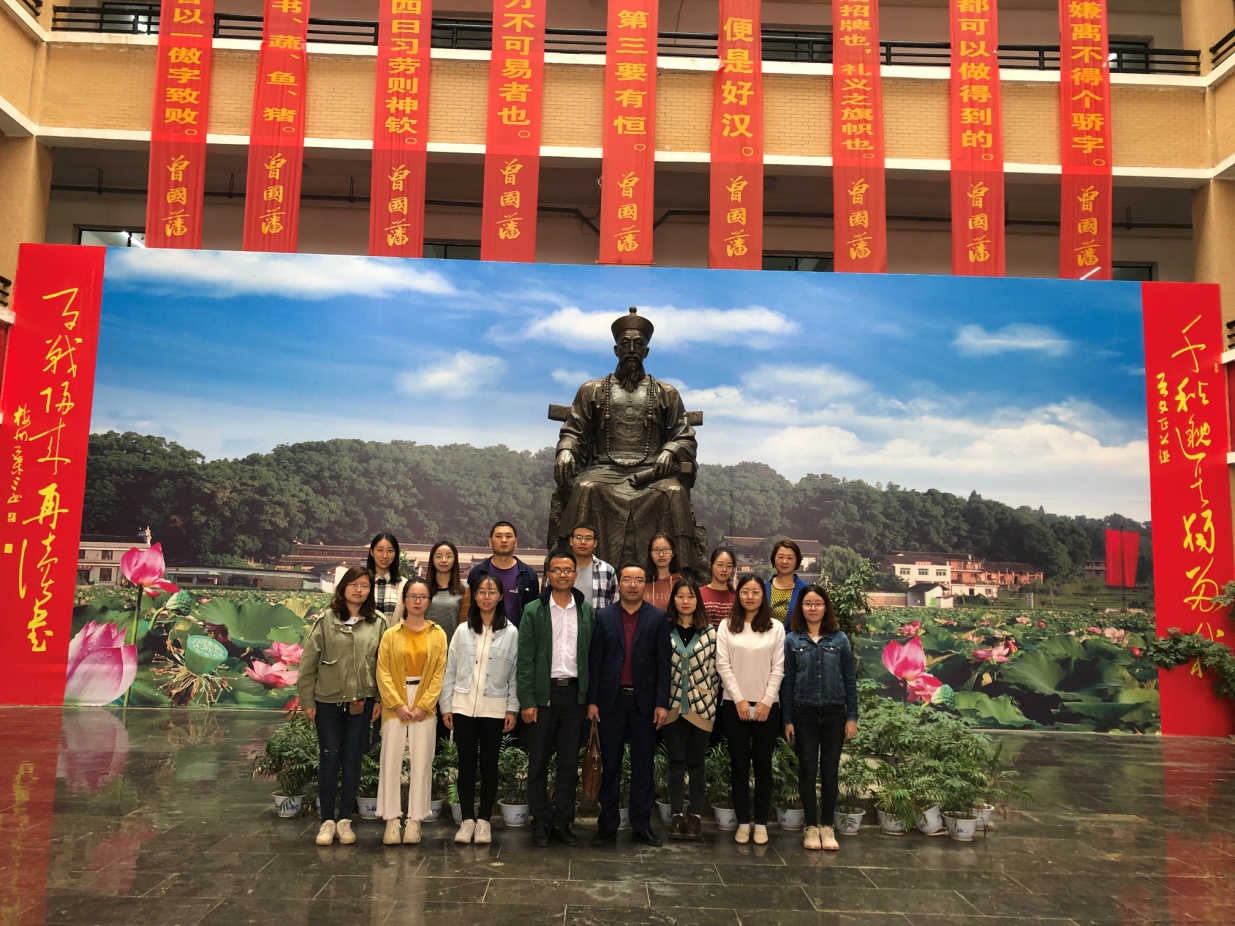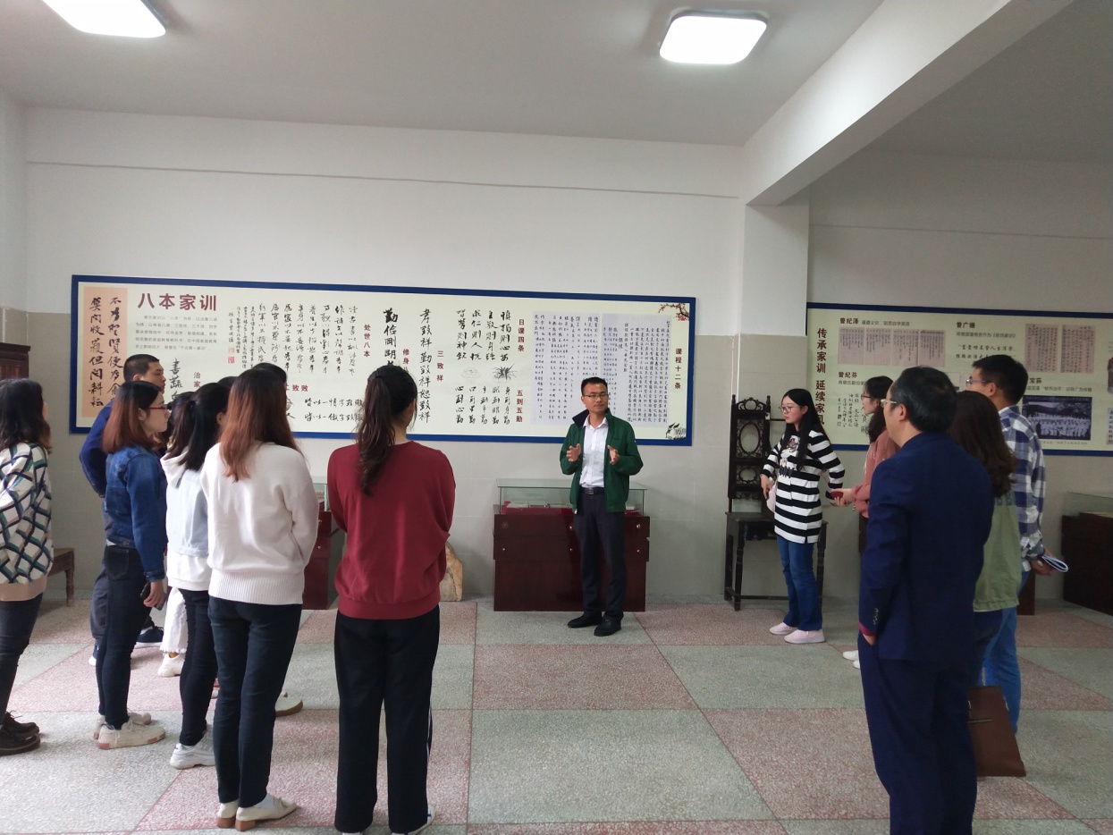 随后,曾国藩学校领导带领实习生团队参观了校内的曾国藩家史馆,王育龙副校长亲自担任展馆解说员,从“八本家训”到“三致祥”再到“英才辈出”,将曾氏家族百余年的历史娓娓道来,实习生们听得津津有味,也被曾氏家族勤俭、求学、务实的家风家训所深深感染。最后,双方领导与实习团队在文正公塑像前合影留念。