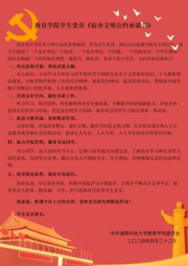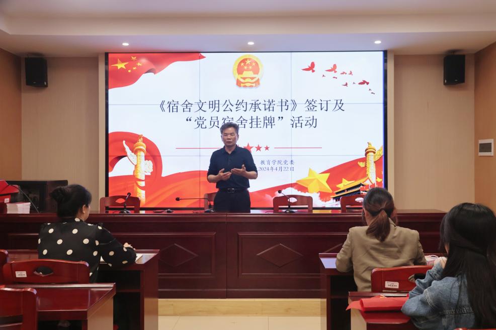 2024年4月22日晚,教育学院在敏行楼A333开展《宿舍文明公约承诺书》签订及“党员宿舍挂牌”活动。会议由学生党员邹宇欣主持。院党委书记李炳煌、副书记文红梅出席。党支部书记及全体学生党员参与。