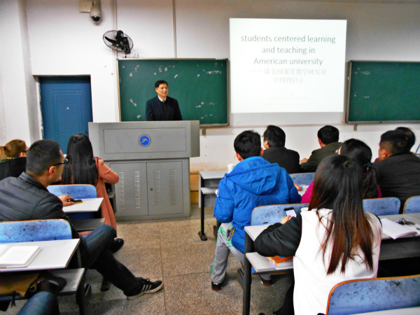 随后,严教授分别呈现了美国本科生和研究生的课堂教学场景,本科生课堂强调师生之间的互动与交流,在研究生课堂中学生则围绕圆桌坐,体现师生之间的平等与自由。