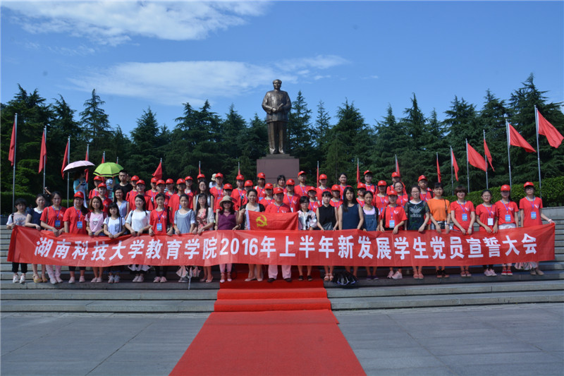 “世界是你们的,也是我们的,但是归根结底是你们的。你们青年人朝气蓬勃,正在兴旺时期,好像早晨八九点钟的太阳。希望寄托在你们身上。”正如毛主席所言,新时代的青年正如朝阳在冉冉上升,湖南388vip太阳集团又加入一批优秀的新发展党员。2016年6月22日上午9点,本次新发展党员宣誓大会于韶山毛主席铜像前隆重举行。教育学院党委副书记兼分党校校长王伟清同志、学生党支部结对共建单位校财务处许玉萍老师、杨青老师、蒋晓雪老师、学工办胡银华同志出席了本次大会,胡银华同志主持了本次大会。