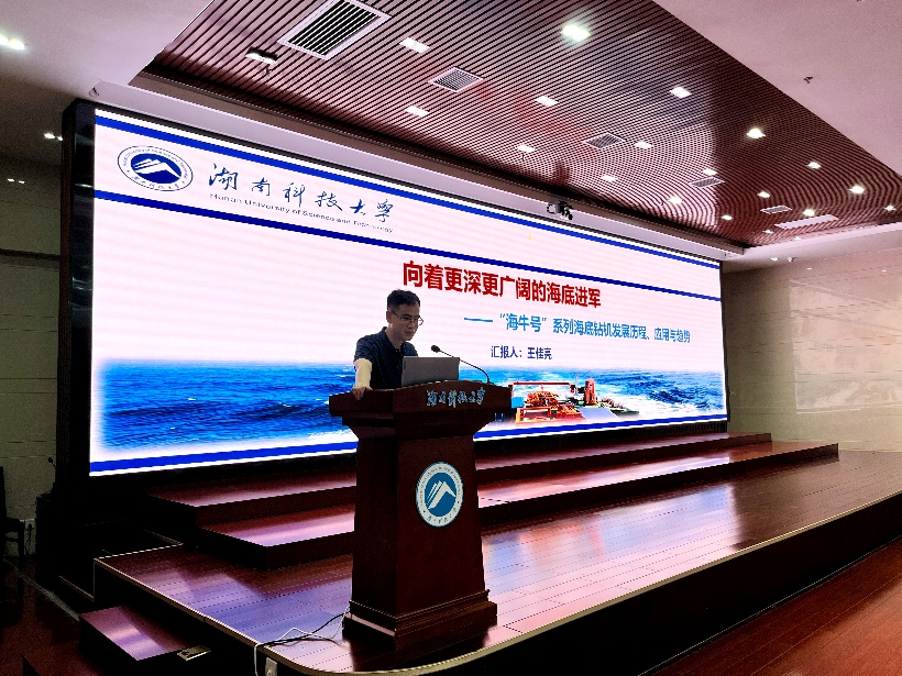 第三站,集训营成员在立德楼五楼报告厅观看了时代楷模、我校“海牛”团队负责人万步炎教授的先进事迹影片。随后,我校“海牛”团队成员代表王佳亮副教授给大家带来题为《向着更深更广阔的海底进军——“海牛号”系列海底钻机发展历程、应用与趋势》的报告,他从海洋强国时代意蕴、海洋取样技术简介、海底钻研技术简介、海底钻机工程案例、海底钻机社会影响等六个方面详细介绍了“海牛号”,并寄语同学们努力学习,向着更高的目标实现自己的理想。