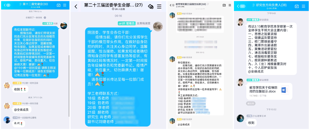 近日,疫情形式严峻,为筑牢校园防控屏障,保障我院学生的健康安全,教育学院于3月15日晚20:45采用线上会议的形式,召开了学生疫情防控会议暨2021-2022第二学期第一次全体学生干部大会。我院党委副书记刘婕出席会议,200余名本科生、研究生学生干部参加。会议由学工办主任李涛主持。