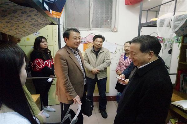 每到一个宿舍,领导老师们都和学生进行了亲切的交谈,细心地询问学生在学习中遇到的问题。李海萍院长还和学生交流正读何书,实地了解学生的思想状态,并且细心地询问学生想要追求的目标和考研与否等问题。当看到学生自觉在寝室准备心理咨询师考试的时候,他倍感欣慰,鼓励学生一定要朝自己的目标坚持下去,在以后想起时才能不后悔。院党委书记李炳煌和学生进行了友好的交谈,并提出:“在学习和生活中遇到任何问题和困难,大家一定要积极地和辅导员交流和反映,学院会尽最大的可能帮助大家,为大家建立一个良好的环境。”他温暖的话语浸润了学生的心。党委副书记王伟清置身学生寝室之中,深情地回忆起了自己当年学习的时光,他感慨现在各方面的条件越来越好了,大家应该好好珍惜和利用现在的所拥有的学习和生活条件,努力学习,早日实现自己的梦想。15年级辅导员尹琼芳老师和16年级辅导员李涛老师对学生们所关心的教师资格证等学习方面的问题作出了解答,表达了对学生们的殷殷期望。