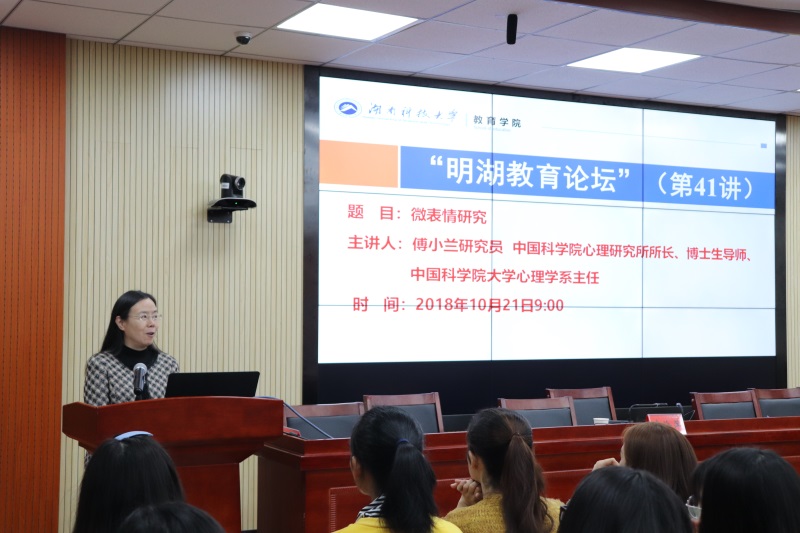 2018年10月21日上午,中国科学院心理研究所所长、博士生导师傅小兰研究员做客“明湖教育论坛”,为我院师生带来了题为“微表情研究”的学术报告。报告会由教育学院院长李海萍主持。