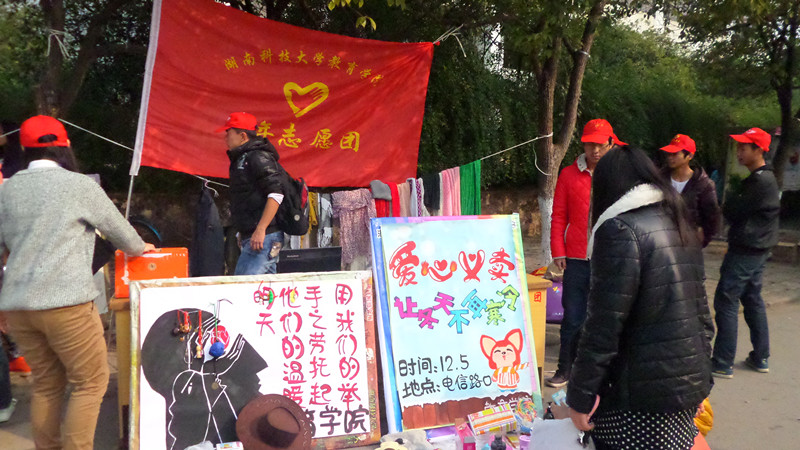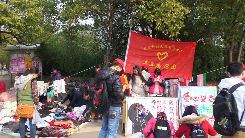 “大家快轮流去吃饭,一会下课就会很忙。”志愿团负责人“吩咐”道,并且准备在人流最大的时候“大赚一笔”。一阵下课铃声过后,电信路口就被挤得“水泄不通”,大家都被这样一个巨大的摊位和多种多样的物品所吸引。“虽然旧了点,但是洗一洗在寝室里穿也很不错”、“我对篮球很感兴趣,所以毫不犹豫的挑选了所有的有关体育的杂志回去看”、“淘到自己所需要的物品,又能奉献自己的爱心,两全其美。”每个人都在把爱心放入募捐箱的一瞬间露出真诚的笑容。